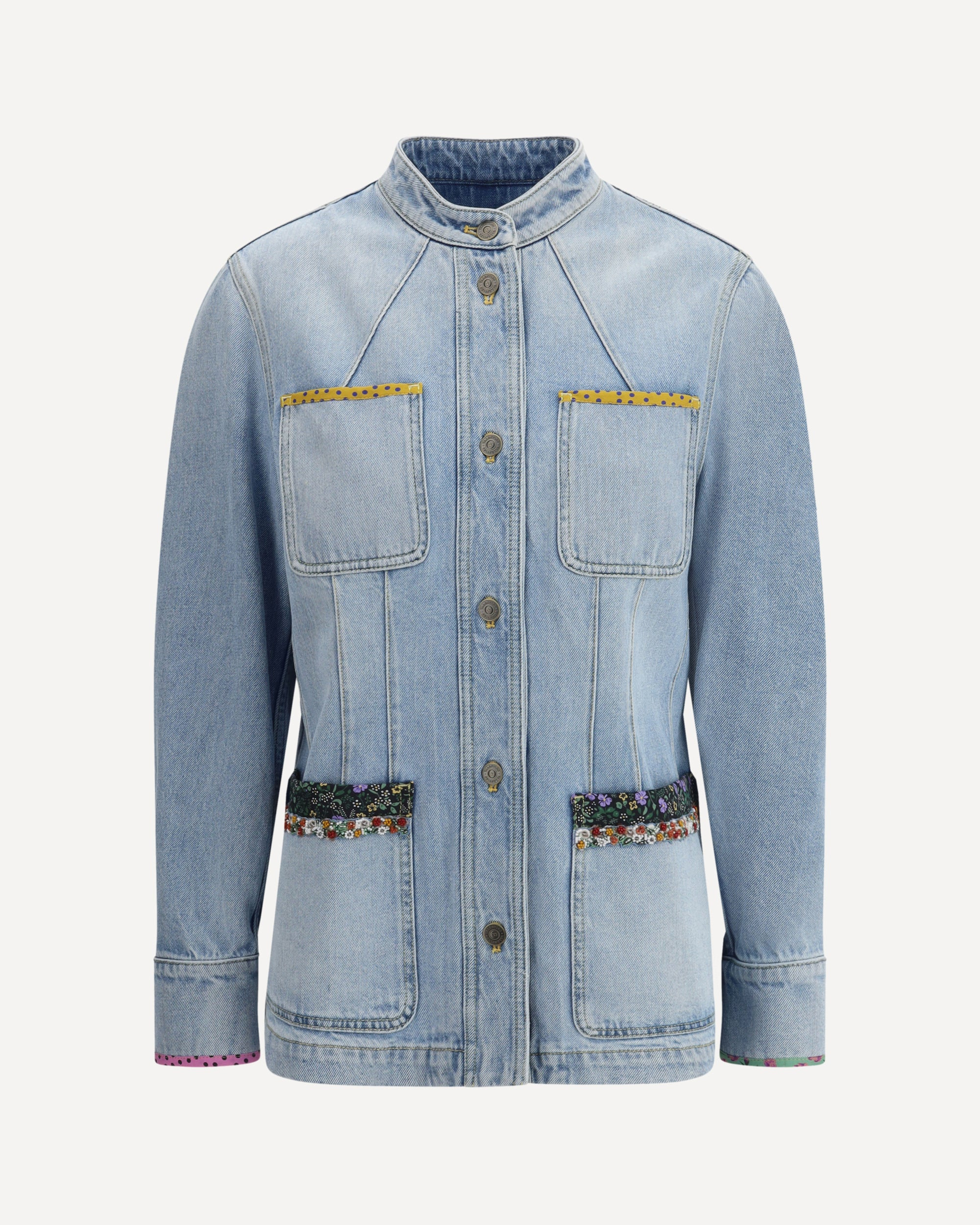 Embellished printed chiffon-trimmed denim jacket Light denim