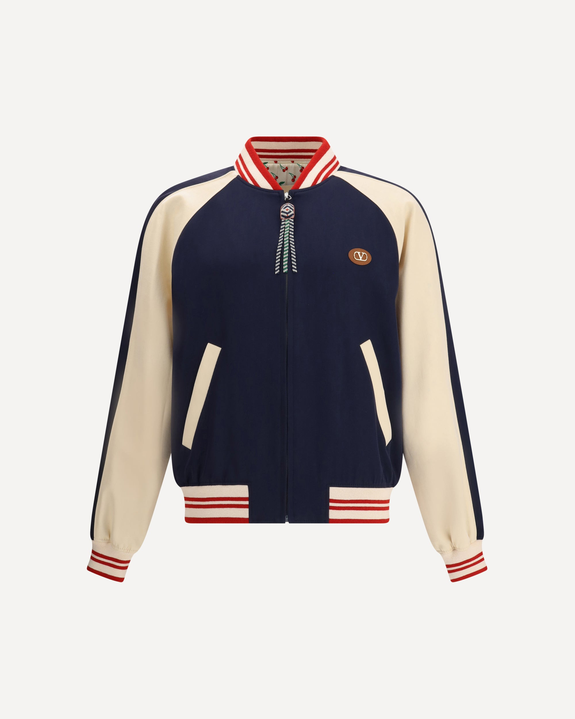 Virgin wool Bomber Jacket signed Valentino, part of the Le Chat De La Maison capsule. The model features a ribbed collar with contrasting stripes, front closure with a double-slider zipper and puller decorated with multicolored beads. Featuring raglan sleeves, two side welt pockets, ribbed cuffs and hem for a defined fit. The front features a golden metal VLogo plaque, while the back panel is embellished with the iconic embroidered cat monogram. An exclusive garment that combines tailoring, originality and unmistakable style. DETAILS - Sku: 7V3CIP63AWS_DYB - Season: AW25 - Fit: Regular - Composition: GENERAL 76% Fleece Wool 24% Cotton - MADE IN ITALY