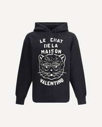 Valentino's Le Chat De La Maison Hoodie is a casual piece with a distinctive, modern character. The adjustable drawstring hood and ribbed hems on the cuffs and hem offer comfort and functionality. The contrasting Le Chat De La Maison print on the front adds a graphic and unique touch, signing the look with Valentino's unmistakable elegance. Perfect for a sophisticated take on casual style. DETAILS - Sku: 7V3MF28NB33_9RA - Season: AW25 - Fit: Regular - Composition: GENERAL 100% Cotton - MADE IN ITALY
