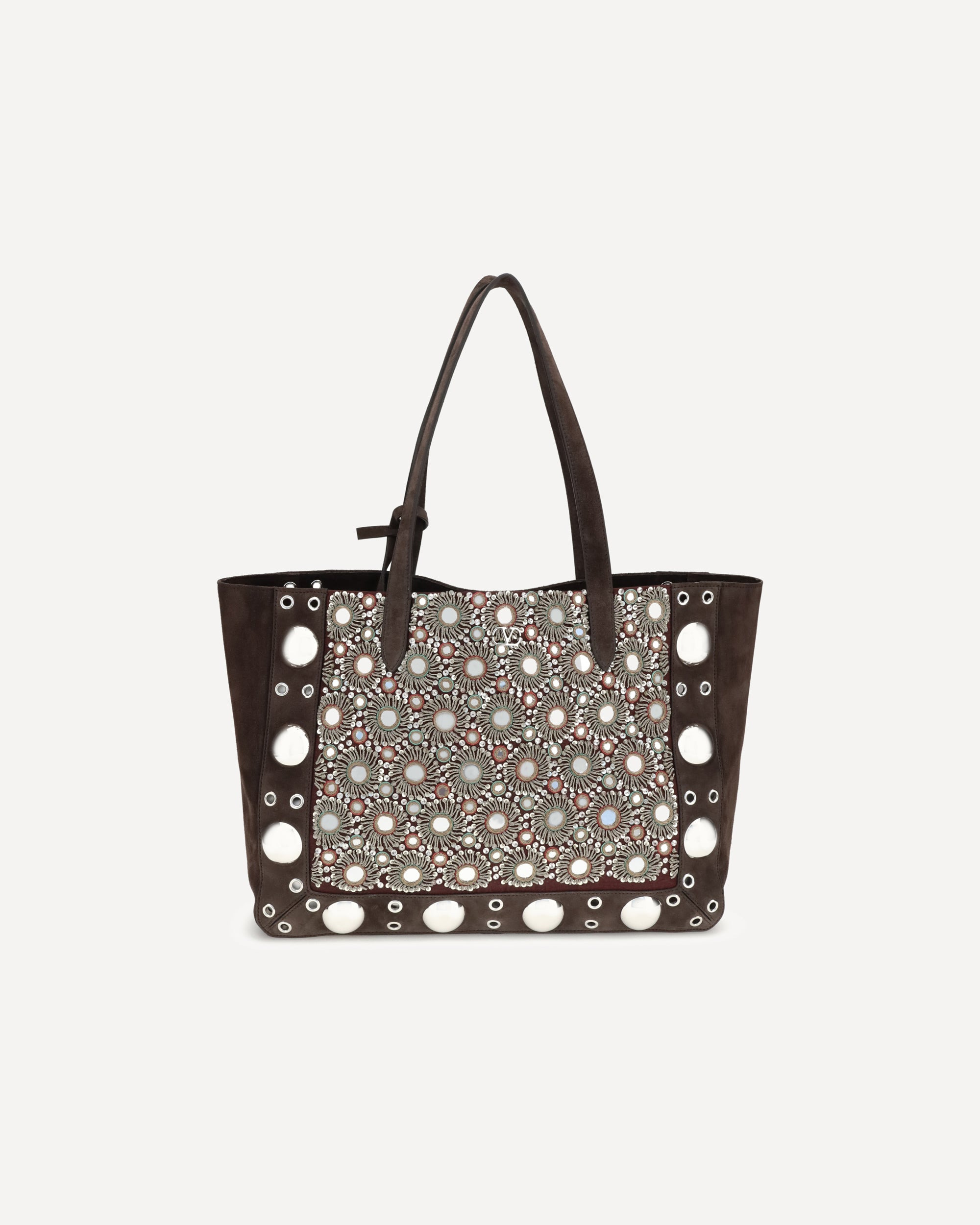 Valentino Garavani's Nellcote medium Tote Bag is a dramatic and refined accessory embellished with mirror and sequin embroidery. The profile is decorated with iconic ball studs and rivets, distinctive elements of the maison. Equipped with comfortable handles, it can be carried either by hand or on the shoulder. Completing the design is the small metallic detail with Signature VLogo and a removable internal pouch, perfect for holding essentials. DETAILS - Sku: 7W2B0R79TAA_RCB - Season: AW25 - Dimension: 40x40x13 - Composition: GENERAL 100% Calf Leather Bos Taurus - MADE IN ITALY