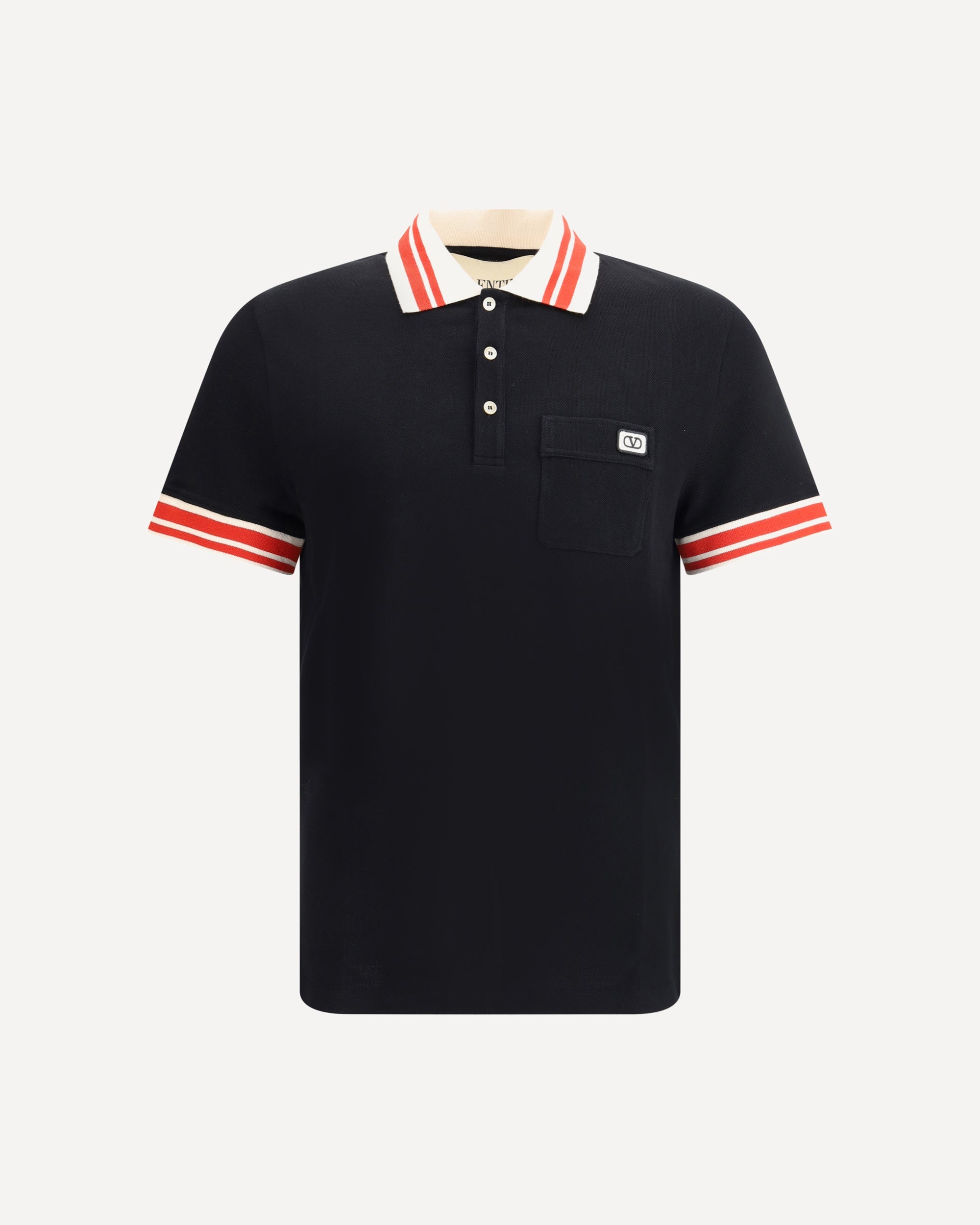 Valentino's Polo Sweater combines sporty elegance and iconic details. Featuring a ribbed collar and three-button front closure, it features an applique pocket on the front embellished with the brand's logo. Contrasting bands on the sleeves add a graphic touch that enhances the silhouette with dynamism and style. DETAILS - Sku: 7V3MH01KB19_0NO - Season: AW25 - Fit: Regular - Composition: GENERAL 100% Cotton - MADE IN ITALY