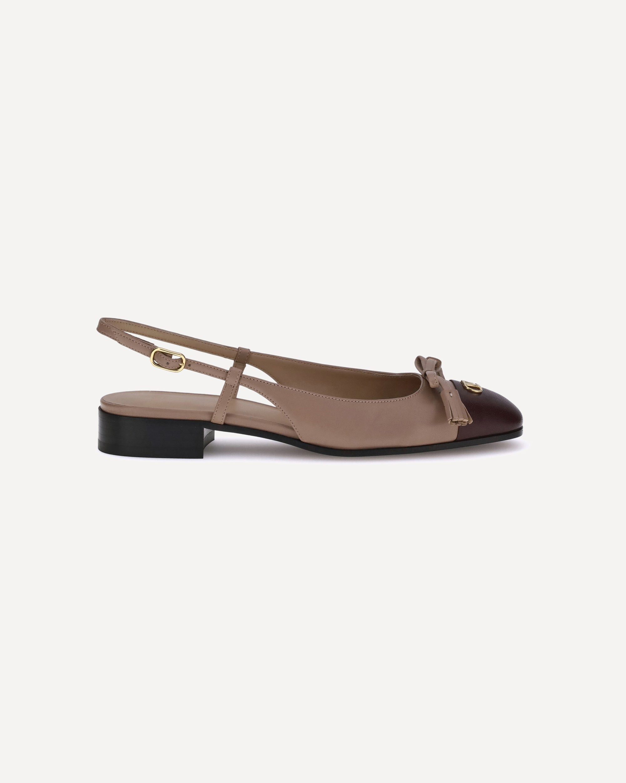Valentino Garavani's Valet Du Roi Ballerinas are a sleek and sophisticated interpretation of the classic slingback style. Closing at the back via an adjustable buckle, they feature a slightly squared toe and a block heel for a comfortable, stable walk. A bow on the front adds a touch of femininity, while the golden plaque with the brand's iconic logo applied to the front underscores their luxury and sophistication. DETAILS - Sku: 7W2S0MH0DDT_AGM - Season: AW25 - Composition: GENERAL 100% Goatskin/hircus Goatskin - MADE IN ITALY