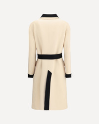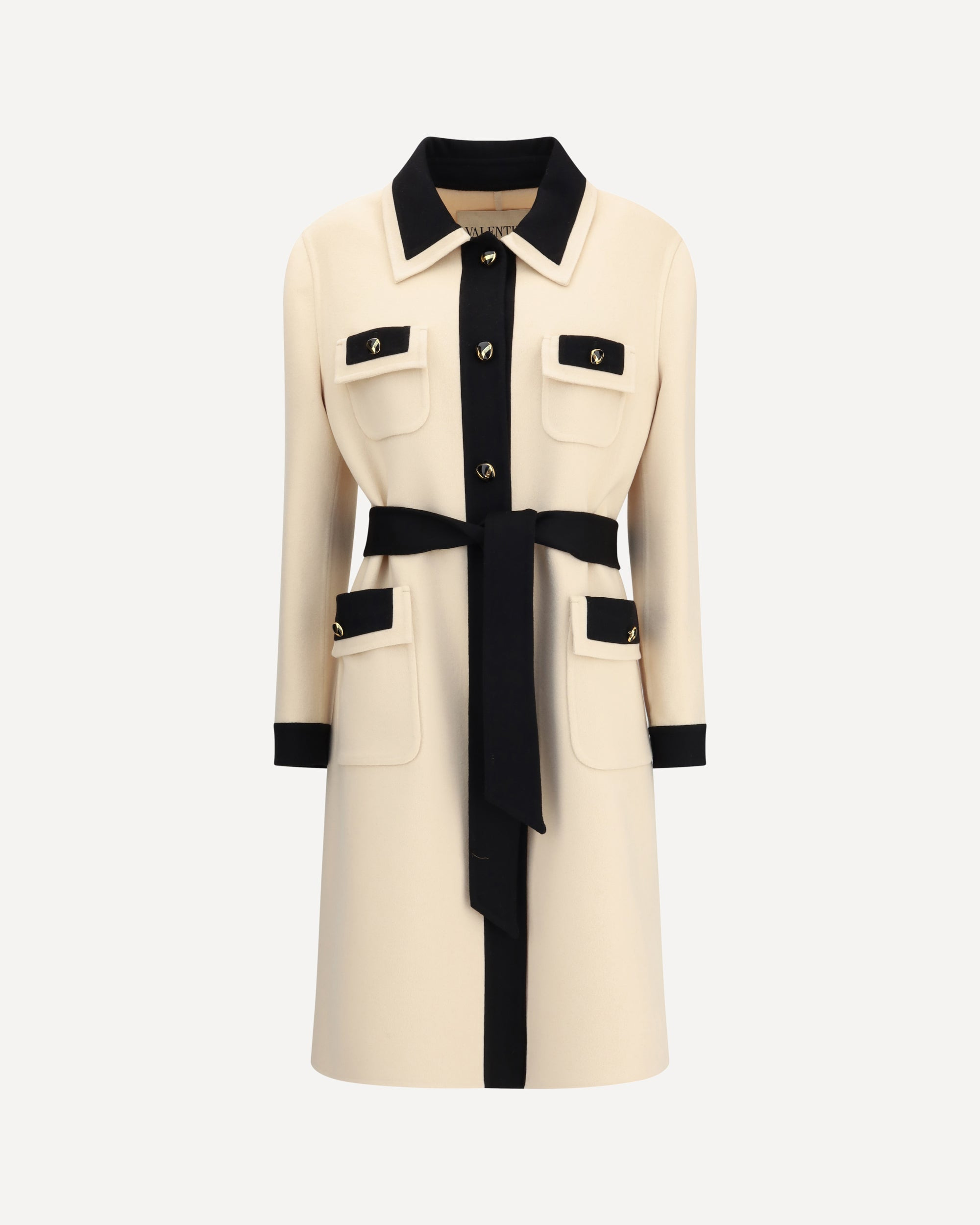 Valentino's virgin wool Coat is a refined piece that combines classic elegance with modern details. The contrasting pointed collar, along with the cuffs and sleeve hem, adds a distinctive graphic touch, while the covered button closure and flap and decorative button pockets recall traditional tailoring. The black fabric belt to tie at the waist enhances the silhouette, making the coat even more feminine and versatile. An essential garment to face winter in style, signed by one of the most iconic maisons of Italian fashion. DETAILS - Sku: 7B3CA7S06JA_R8E - Season: AW25 - Fit: Regular - Composition: GENERAL 90% Fleece Wool 10% Kashmir/capra Hircus - MADE IN ITALY