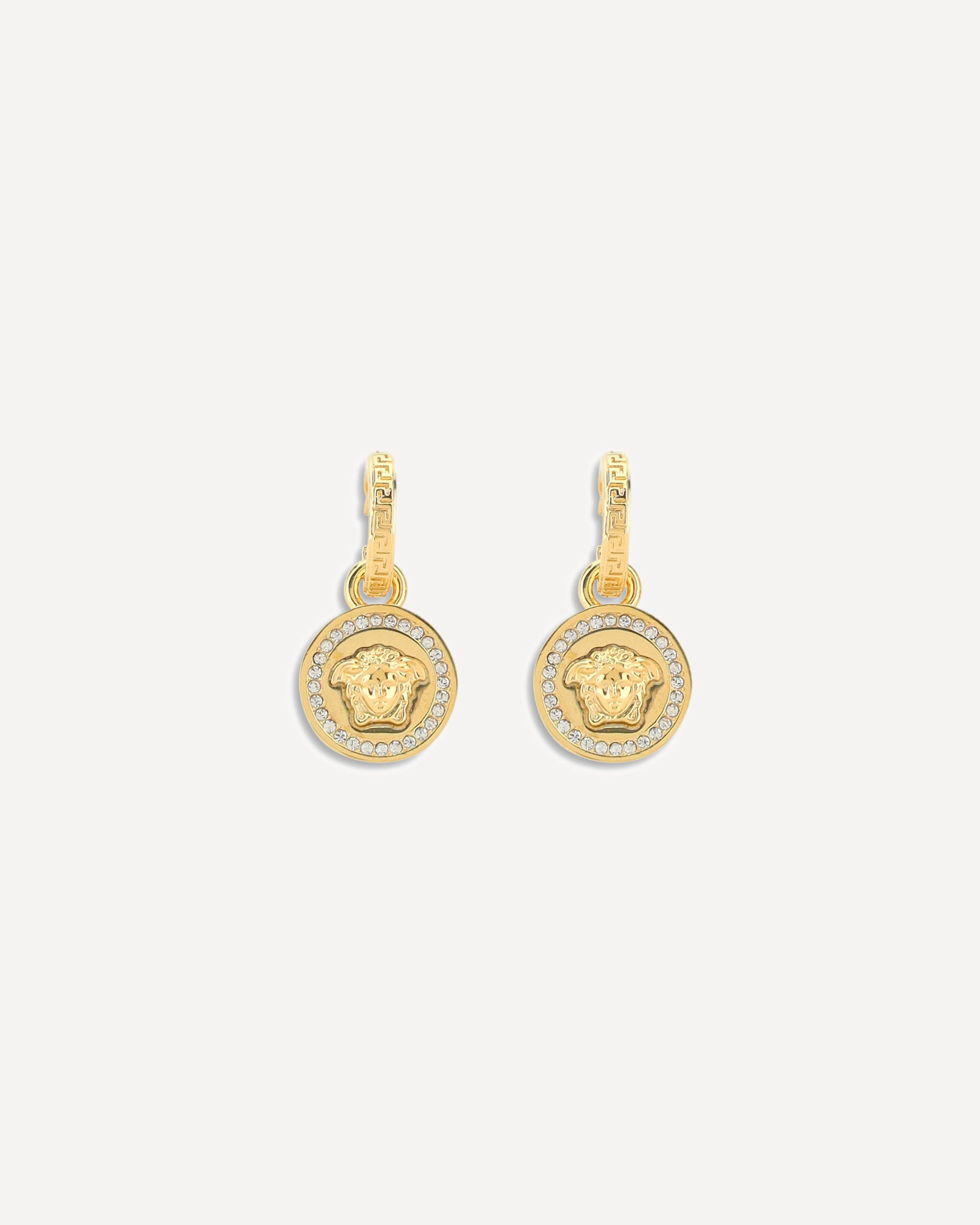Earrings by Versace, round design, iconic Medusa head embossed on the front. DETAILS sku DG2D748DJMX_D01O composition : BRASS 100% color group : GOLD gender : WOMAN season : SS24 size chart : WOMAN UNI category name : EARRINGS