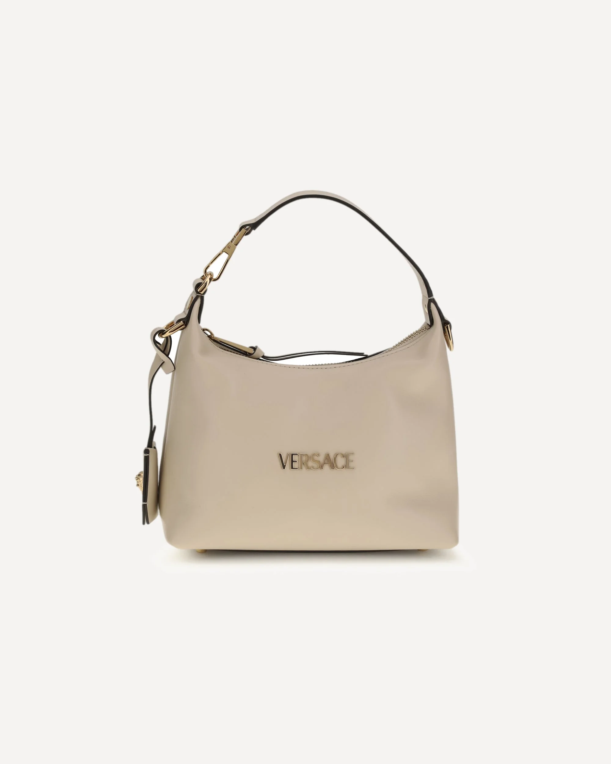The Leather Hobo Handbag by Versace, flat handle that can be opened on one side, adjustable and removable flat shoulder strap, three-dimensional iconic brand monogram plaque applied to front, zipper closure at top, metal feet at base of bag, single interior compartment. DETAILS - Sku: 10183021A13171_1YD7V - Season: SS26 - Dimension: 21x21x9 - Composition: GENERAL 100% Calf Leather Bos Taurus - MADE IN ITALY