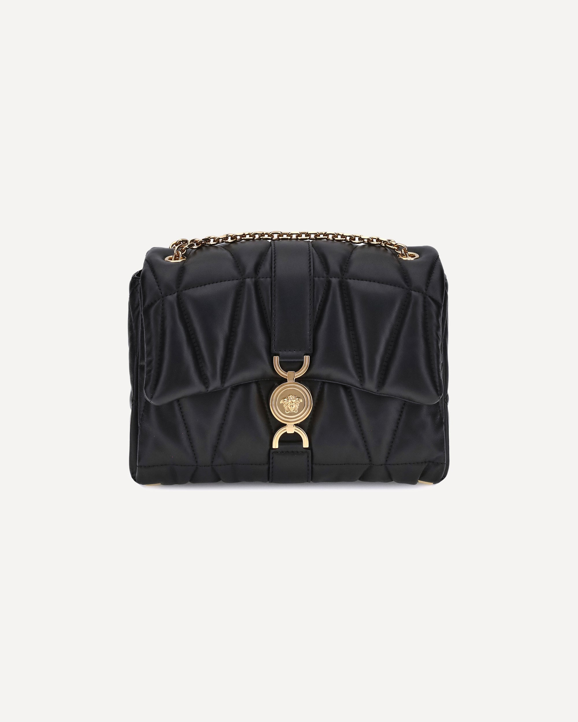 The Kleio Shoulder Bag by Versace is crafted from soft quilted lambskin, embellished with the Medusa '95 metal detail on the front, an iconic symbol of the Maison. The metal chain shoulder strap is versatile and can be worn single or double, adding a touch of elegance. The closure is via a magnetic button, while the lined interior is organized with a patch pocket and three compartments for perfect functionality. DETAILS - Sku: 10159641A12973_1B00V - Season: AW25 - Dimension: 22x22x9 - Composition: GENERAL 100% Calf Leather Bos Taurus - MADE IN ITALY