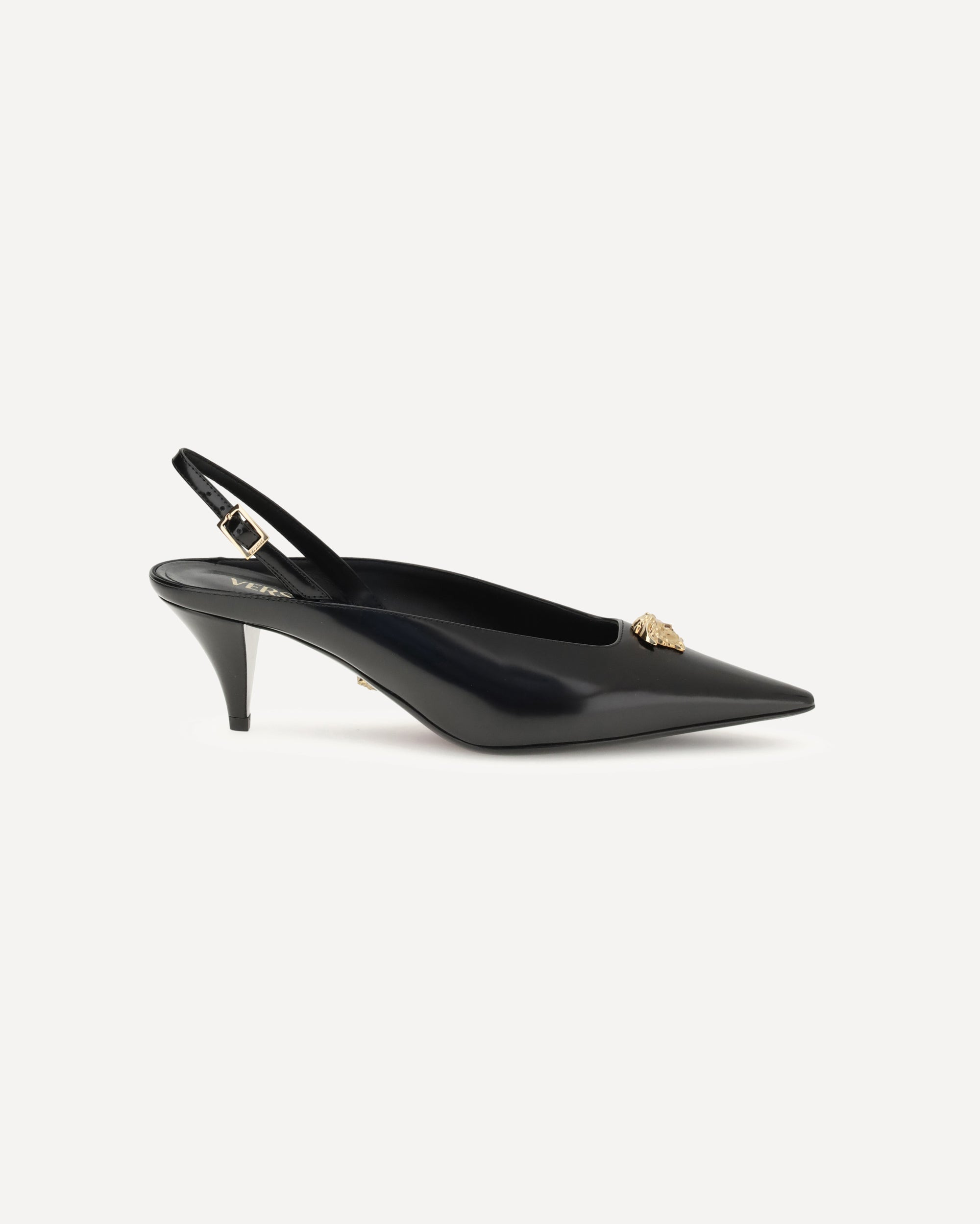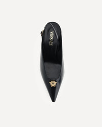 Versace's La Medusa slingback Pumps combine elegance and iconic identity in a refined design. Crafted from glossy calfskin, they feature a pointed silhouette and a low heel that makes them comfortable and versatile. The adjustable ankle strap ensures a secure fit, while the three-dimensional La Medusa accessory on the front adds a distinctive touch typical of Versace's bold style. DETAILS - Sku: 10219051A14835_1B00V - Season: AW25 - Composition: GENERAL 100% Leather - MADE IN ITALY