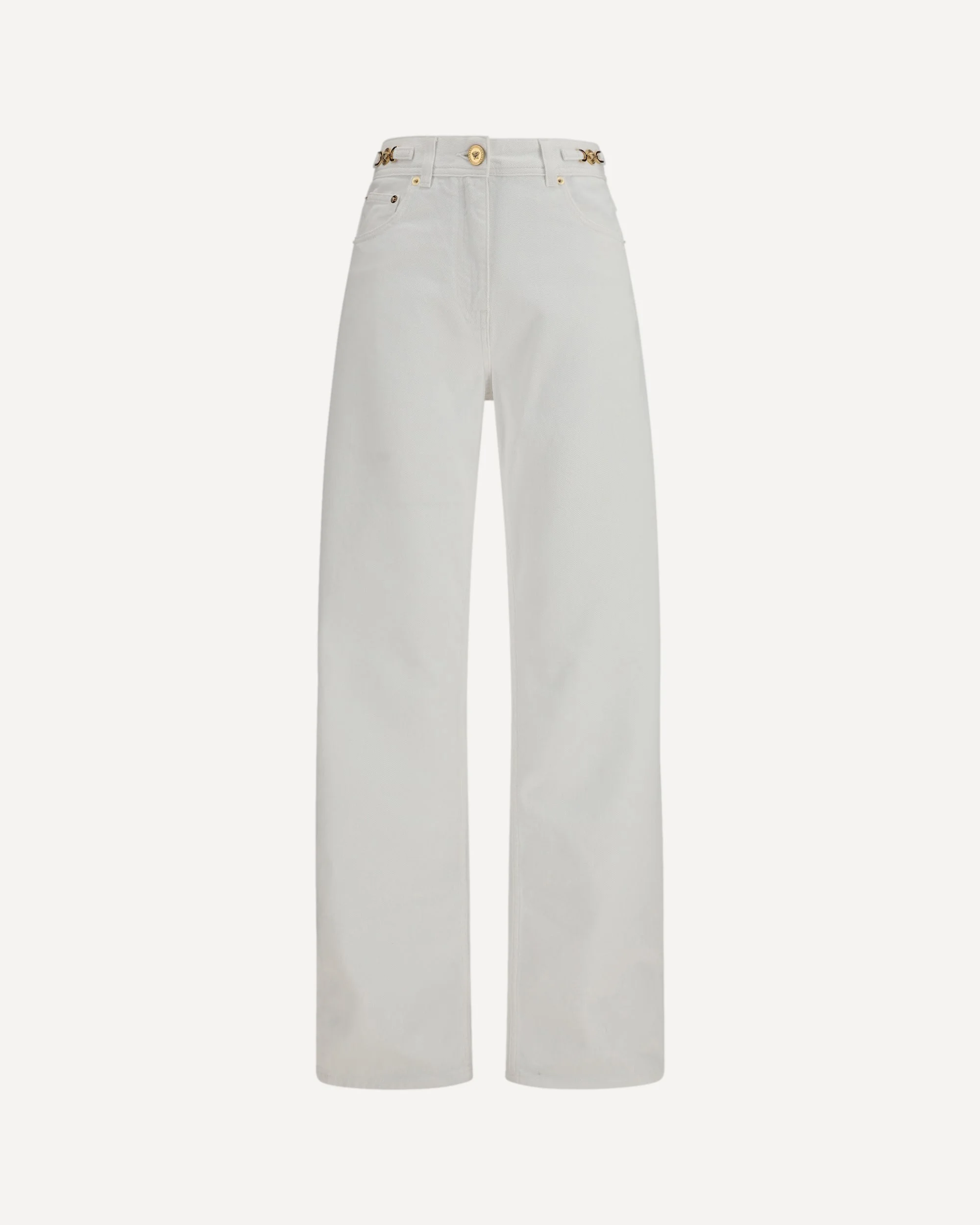 The Medusa '95 straight Jeans by Versace, made from cotton denim, combine iconic style and timeless wearability thanks to their straight leg and classic five-pocket design. Featuring the Medusa '95 plaque, embossed logo patch on the back, and logo button, they have a zip and button closure, belt loops, and gold-colored hardware. Perfect for a casual luxury look with a bold character. DETAILS - Sku: 10137451A08570_1D110 - Season: SS26 - Fit: Regular - Composition: GENERAL 100% Cotton - MADE IN ITALY
