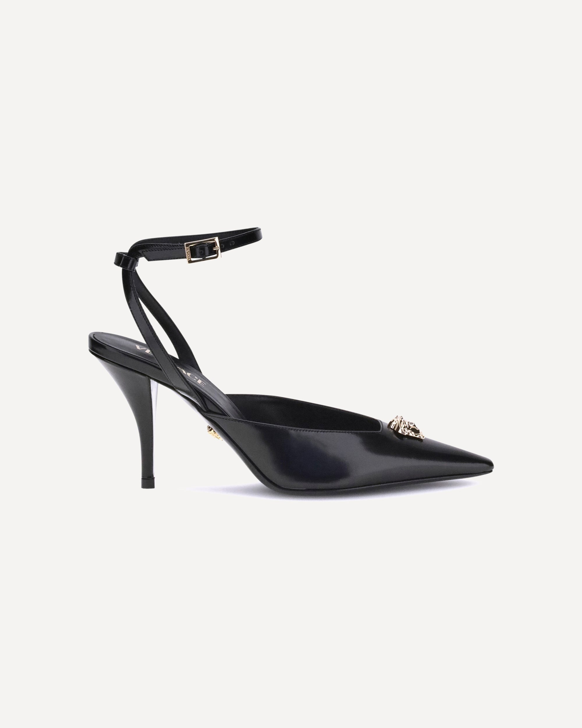 Versace's Medusa Decollete is an elegant and bold slingback made of patent calfskin with a tapered toe. The sleek stiletto heel enhances femininity, while the iconic La Medusa accessory on the upper adds a distinctive and recognizable touch, symbolizing the brand's unmistakable signature. DETAILS - Sku: 10204791A14835_1B00V - Season: AW25 - Composition: GENERAL 100% Calf Leather Bos Taurus - MADE IN ITALY