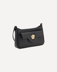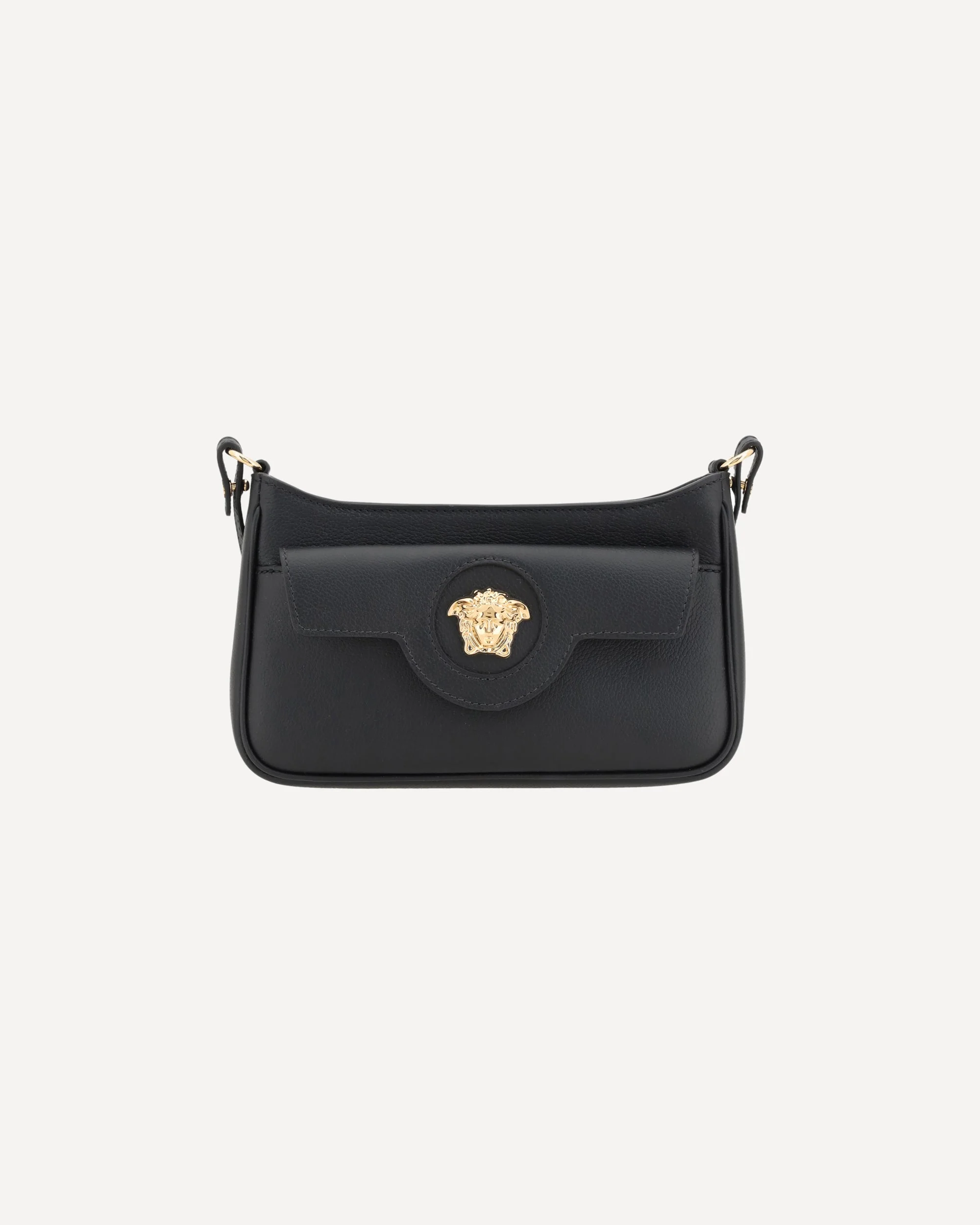 Versace's Mini Medusa Leather Shoulder Bag is a sophisticated and practical accessory perfect for those seeking elegance and functionality. Made of high-quality leather, it features an adjustable flat strap that allows it to be worn comfortably on the shoulder or crossbody. The top zipper closure provides security, while the front pocket with magnetic flap is embellished with the iconic golden Medusa logo, a distinctive symbol of the brand. Inside, the single compartment offers enough space for your essentials, making it ideal for a chic and versatile everyday look. DETAILS sku 1017739DVIT2T_1B00V composition: CALF LEATHER BOS TAURUS 100% color group: BLACK gender: WOMAN season: SS25 size chart: UNI category name: SHOULDER BAGS dimensions: 12.5 x 22 x 4.5 cm