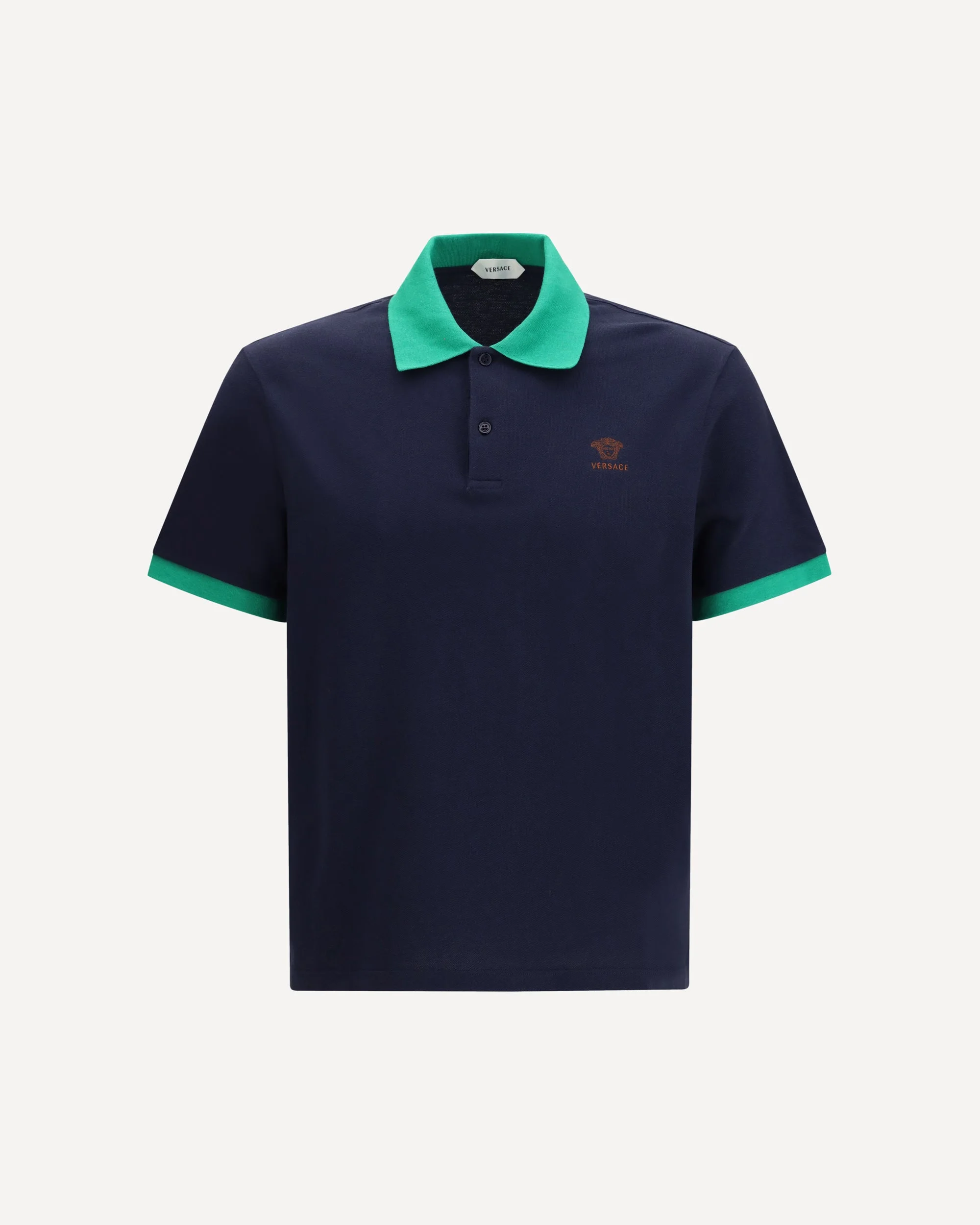 The Polo in cotton pique with embroidery by Versace delivers a refined sporty aesthetic with iconic appeal. Crafted from cotton pique in a slim fit, it features short sleeves, a pointed collar and contrasting ribbed trims. A three-button fastening completes the design, while the embroidered Medusa and Versace logo on the front add a distinctive signature touch. DETAILS - Sku: 10240311A17681_2U3I0 - Season: SS26 - Fit: Regular - Composition: GENERAL 100% Cotton - MADE IN ITALY