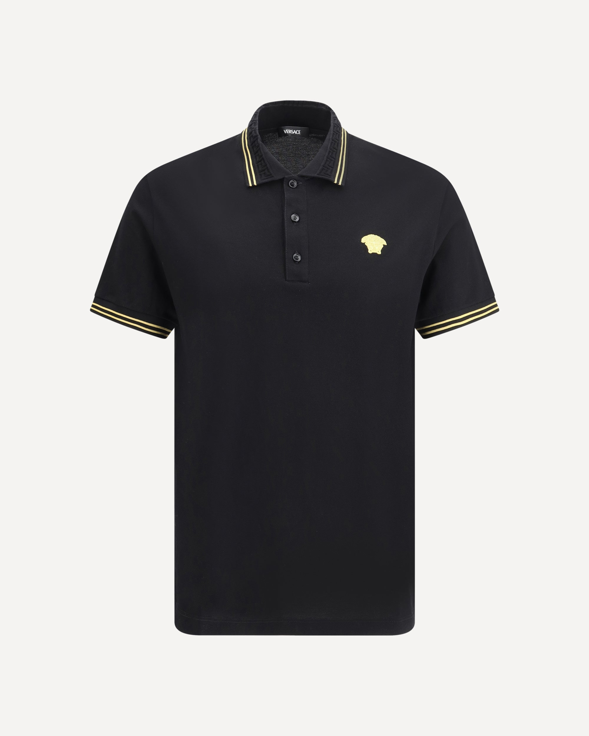 Cotton Polo Shirt by Versace, classic ribbed collar, tone-on-tone front buttons, iconic brand logo patch applied on front, regular fit. DETAILS sku 10139101A09860_1B000 composition: COTTON 100% color group: BLACK gender: MAN season: SS25 size chart: STANDARD category name: POLO SHIRTS