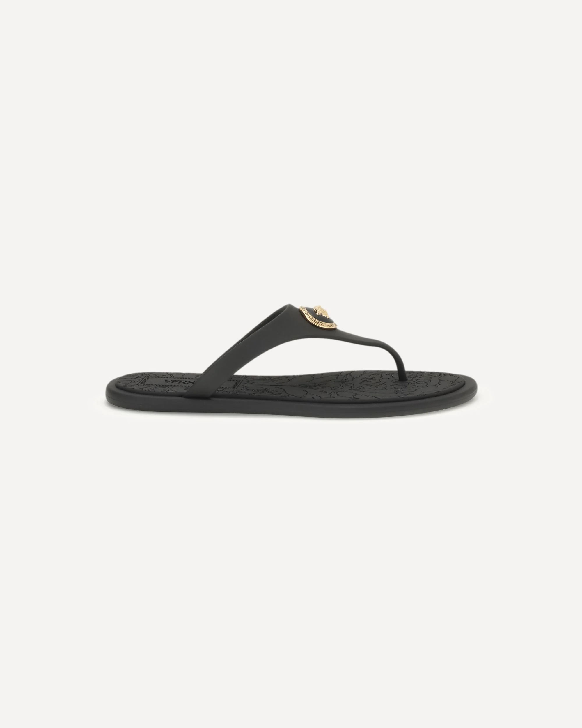 The rubber Thong Sandals by Versace feature an essential yet instantly recognizable design, with the Medusa applique on the instep adding an iconic touch. Made entirely of rubber, they offer lightness and practicality, while the round toe ensures everyday comfort. The model is completed by the logo embossed on the inside and the Maison's typically bold aesthetic. DETAILS - Sku: 10162481A10983_1B00V - Season: SS26 - Composition: GENERAL 100% Rubber - MADE IN ITALY