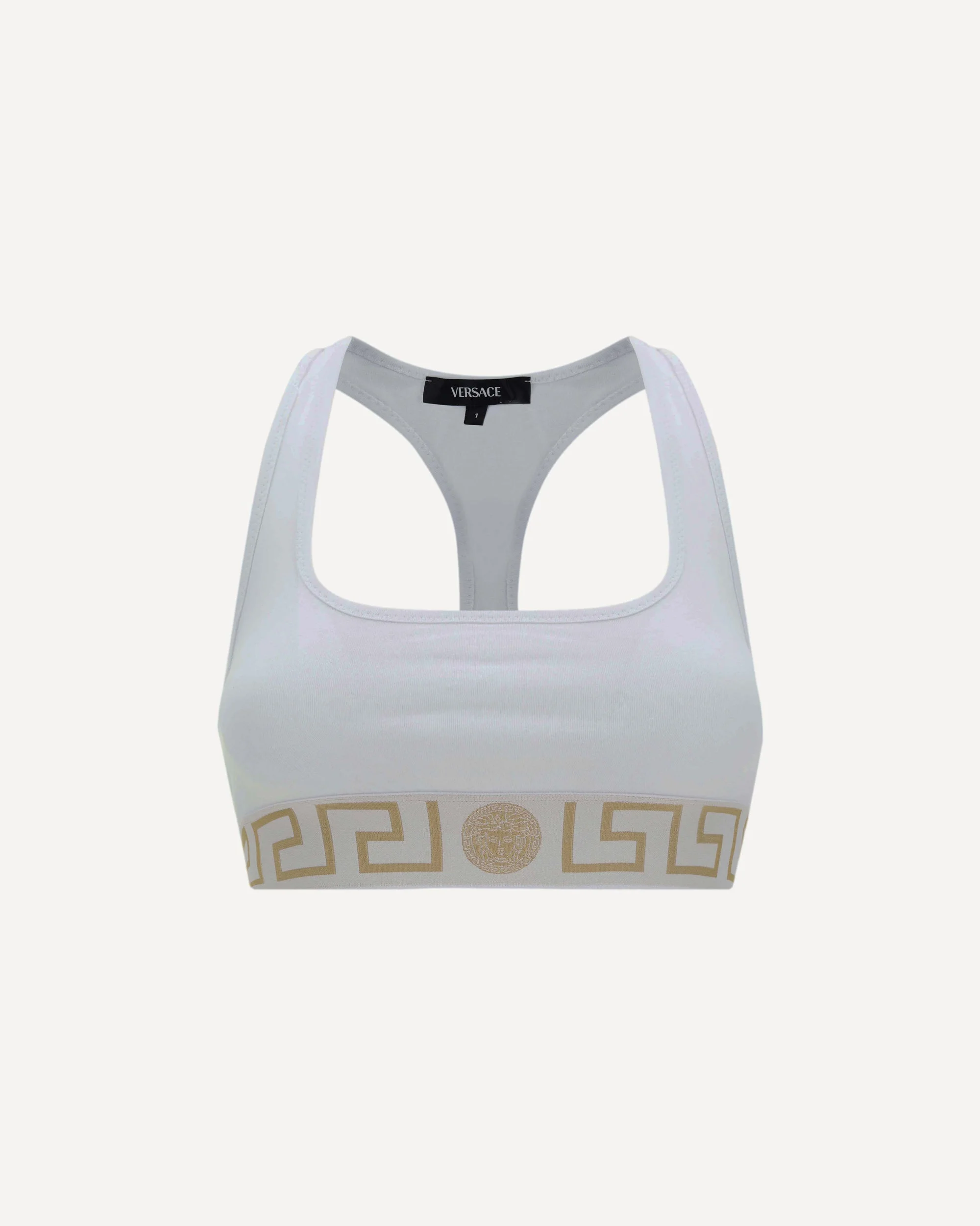 Cotton Underwear Top by Versace, elasticized bust lap with iconic all-over repeated brand motif, close fit. DETAILS sku AUD010391A10011_A1001 composition: COTTON 100% color group: WHITE gender: WOMAN season: AW24 size chart: NUMERIC category name: TOP