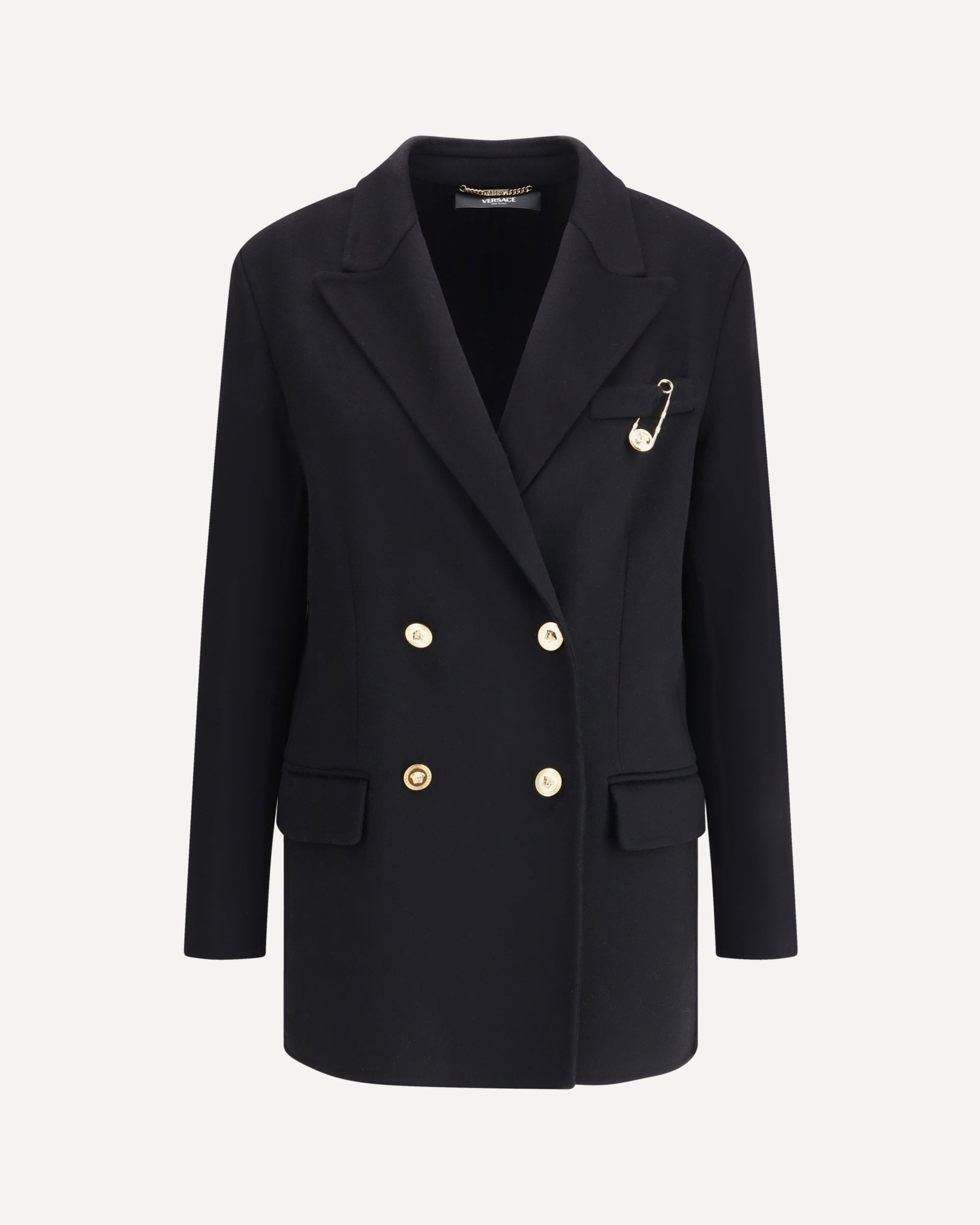 The Double-breasted Coat in wool and cashmere blend by Versace combines sartorial elegance with iconic details. The notched lapel, long sleeves, and front patch pockets enhance the coat’s classic lines, while the Safety Pin accessory and Medusa buttons add a distinctive character. Buttoned cuffs and the rear vent complete the design, perfectly balancing style and functionality. DETAILS - Sku: 10209711A15400_1B000 - Season: AW25 - Fit: null - Composition: GENERAL 50% Kashmir/capra Hircus 50% Wool - MADE IN ITALY
