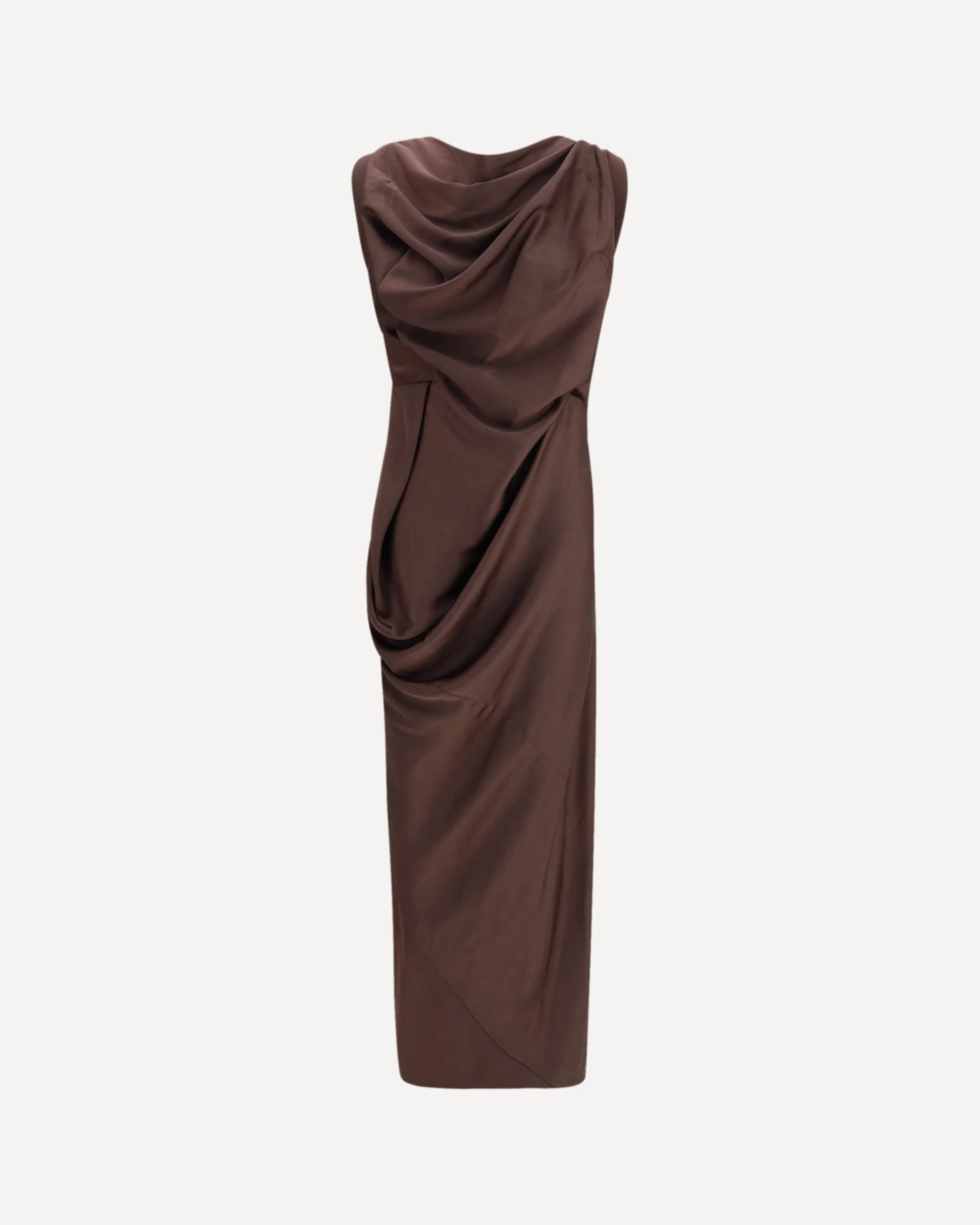The Long Fond Dress by Vivienne Westwood embodies the brand’s signature sculptural elegance and effortless fluidity. Crafted from lustrous satin, it wraps the bust and waist in refined draping that shapes a graceful column silhouette. The softly draped neckline and cinched waist highlight the feminine form, while the asymmetric hem and flowing gathers at the back create movement and depth. Finished with a concealed side zip that preserves its clean, minimalist lines, this piece is a timeless expression of Westwood’s artistry—where structure meets sensuality with impeccable finesse. DETAILS - Sku: 110103A5W01AD_D401 - Season: AW25 - Fit: Regular - Composition: GENERAL 100% Polyester - MADE IN ITALY