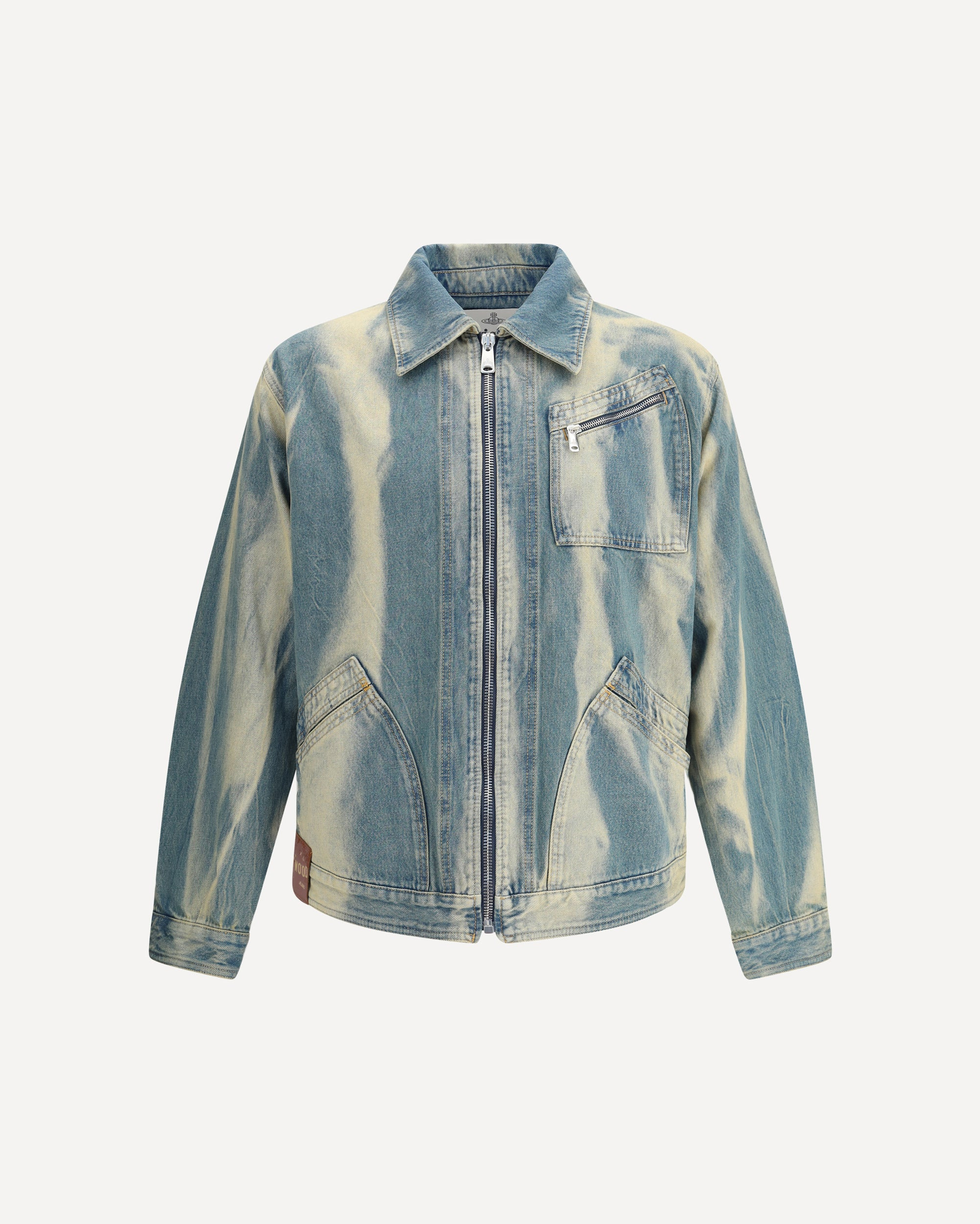 Vivienne Westwood's Piranha denim Jacket features a worn-effect indigo finish and an Orb-shaped zipper pull, the brand's iconic symbol. The design features a pointed collar, a zippered chest pocket, two slanted side pockets, and a paneled construction that enhances the fit. Long sleeves with button cuffs, straight hem and double-stitched seams complete the garment. DETAILS - Sku: 2801000JW018A_K311 - Season: AW25 - Fit: Regular - Composition: GENERAL 100% Cotton - MADE IN TUNISIA
