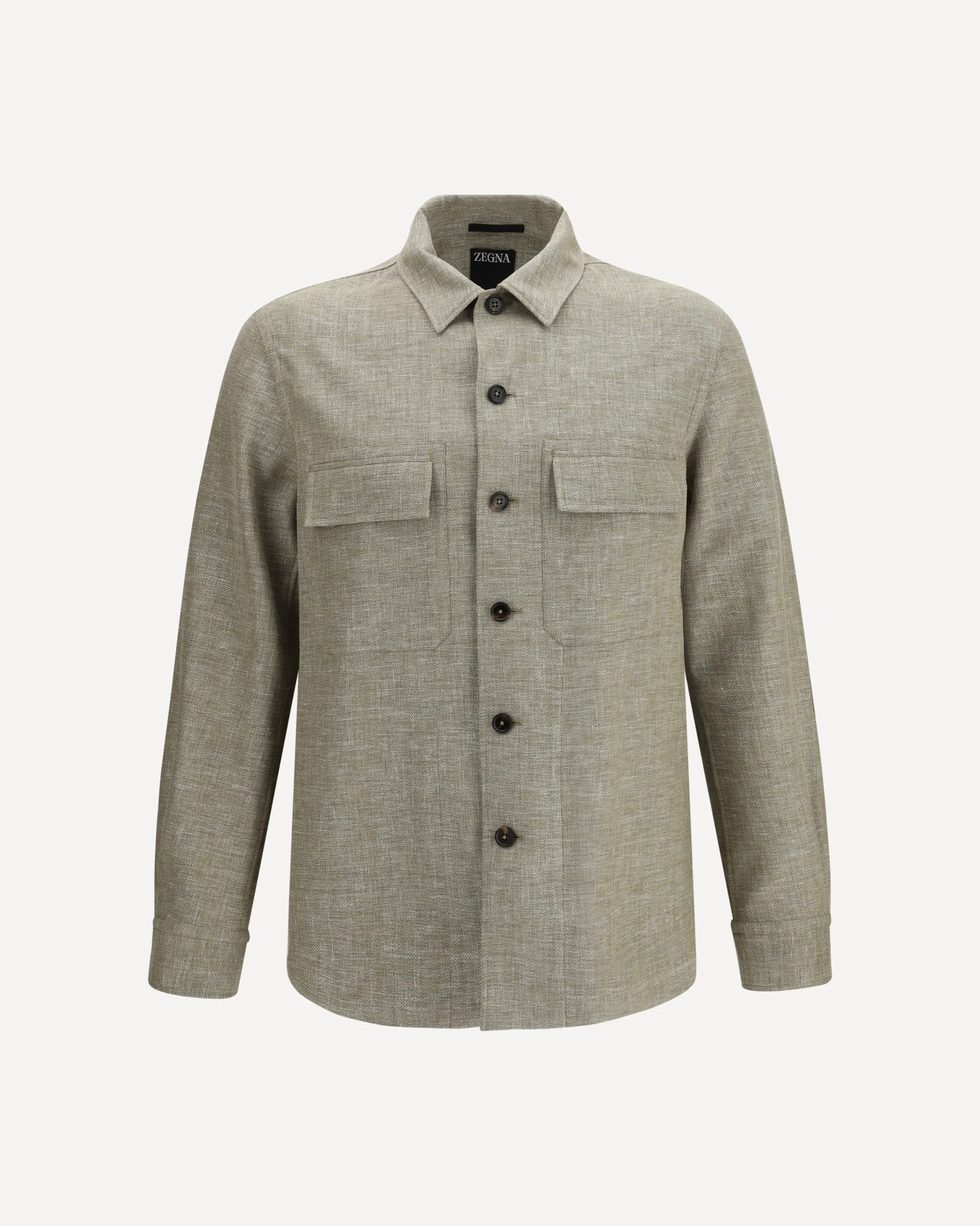 The crossover Overshirt in linen, wool, and silk by Zegna combines refined materials with a contemporary design. It features a front button fastening and a classic shirt collar. The long sleeves are finished with buttoned cuffs and elbow patches for a functional and distinctive touch. A leather Zegna 232 Road brand mark is applied at the back of the neck. Patch chest pockets with flaps, side slits at the hem, and a straight hem complete the balanced and versatile silhouette. DETAILS - Sku: UHV22A3SOT6BV04_054 - Season: SS26 - Fit: Regular - Composition: GENERAL 50% Linen 31% Wool Ovis Aries 19% Silk - MADE IN CHINA