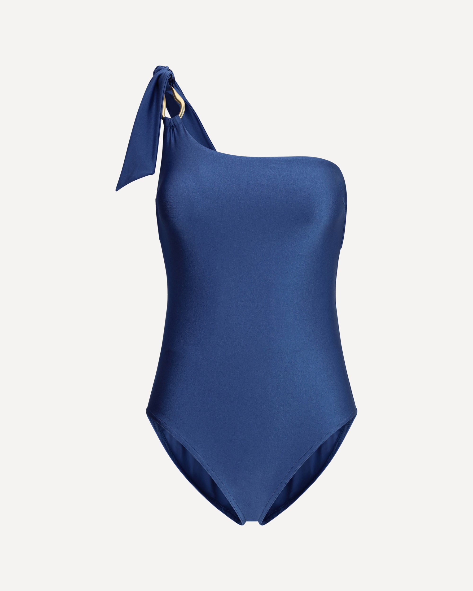 The Ascension one-piece Swimsuit by Zimmerman is a garment that combines elegance and sensuality in a minimalist yet sophisticated design. The one-shoulder style, with an adjustable knotted strap, adds a touch of originality and practicality, while gold detailing lends an accent of luxury and sophistication. Made of glossy lycra, the swimsuit hugs the skin with a shiny finish that enhances the silhouette. The opaque bottom ensures a comfortable and secure fit without compromising style. DETAILS - Sku: 4321WSS253_MDBL - Season: AW25 - Fit: Slim - Composition: GENERAL 80% Polyamide 20% Elastane - MADE IN VIETNAM