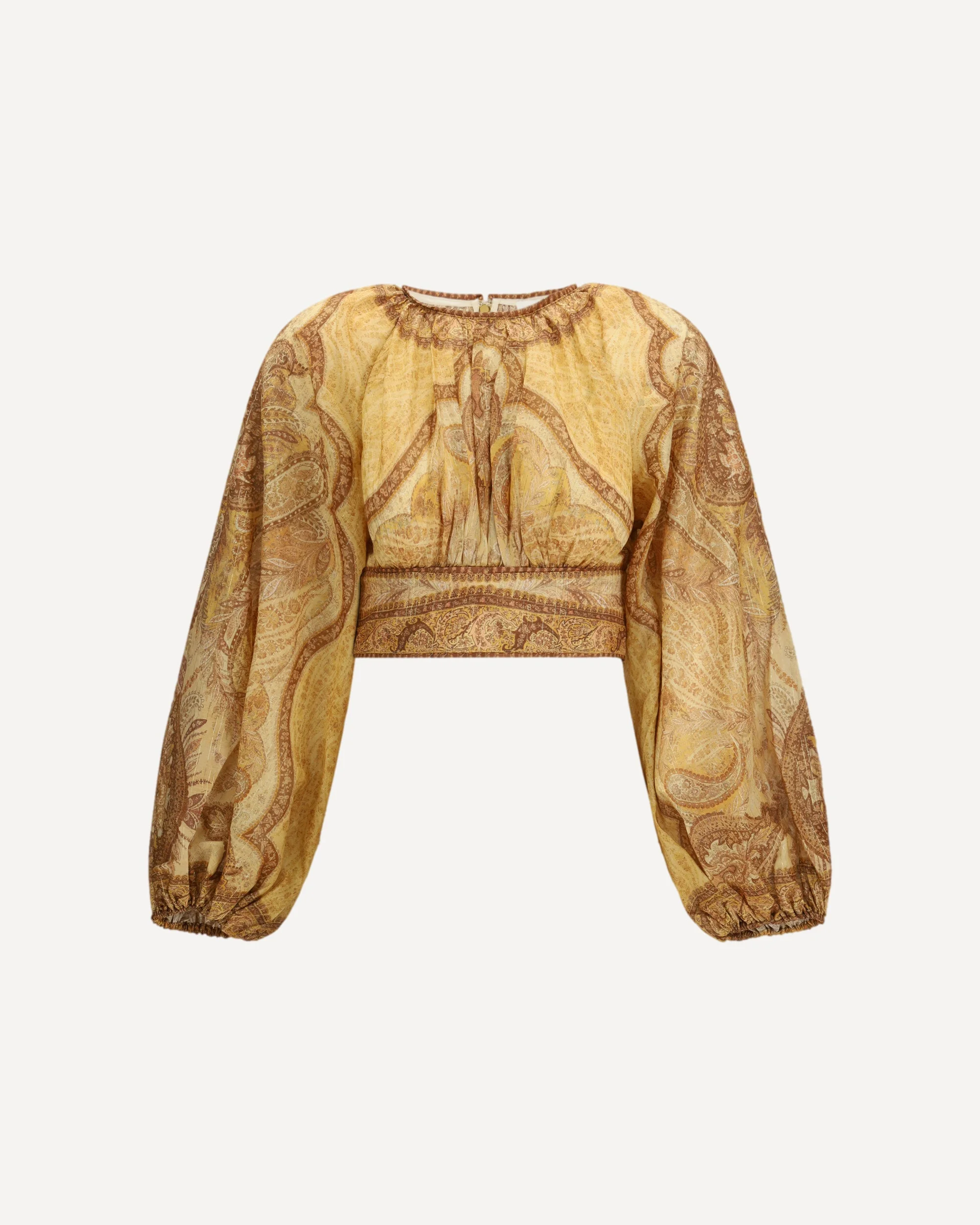 The Bustier Top Wanderlust by Zimmermann captures the brand’s signature romantic yet structured aesthetic. Crafted from a refined cotton-silk blend, this cropped top features long billowing sleeves with elasticated cuffs, adding softness and movement. The round neckline balances the silhouette, while the fitted waistband defines the waist with elegance. Gathering across the bust and back introduces gentle volume, complemented by a shirred back bodice with internal boning for added support and shape. Finished with placement embroidery, this piece stands out as a decorative and feminine statement, perfect for elevated, expressive styling. DETAILS - Sku: 6436TRS262_TPMM - Season: SS26 - Fit: Regular - Composition: GENERAL 72% Cotton 25% Silk 3% Other Fibres - MADE IN SRI LANKA