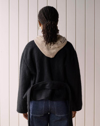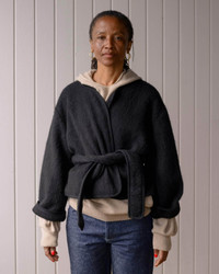 Product Details Brushed wool jacket with self belt Model wears a size XS/S 100% Wool Made in France Fiber origin - South America Spun in Czech Republic Knitted in France Sewn in France Material Wool Origin: Australia, Austria Certificates: Oeko-tex 100, Woolmark, SustainaWOOL - Wool comes from sheep and goats. - The process of producing wool fabric starts with shearing the sheep, after which impurities are removed. Wool is then separated into different quality classes based on fiber diameter, length and color. - Wool regulates body temperature and is breathable. - The fabric is biodegradable, and it comes from a renewable source. - Wool is often seen as the technical fabric of nature because it also absorbs moisture without feeling wet or cold, is antibacterial and has odor-fighting properties. - The natural crimps of wool allow the fabric to maintain its shape well and endure stretching. - Wool is resistant to static electricity, hypoallergenic and fire-resistant.