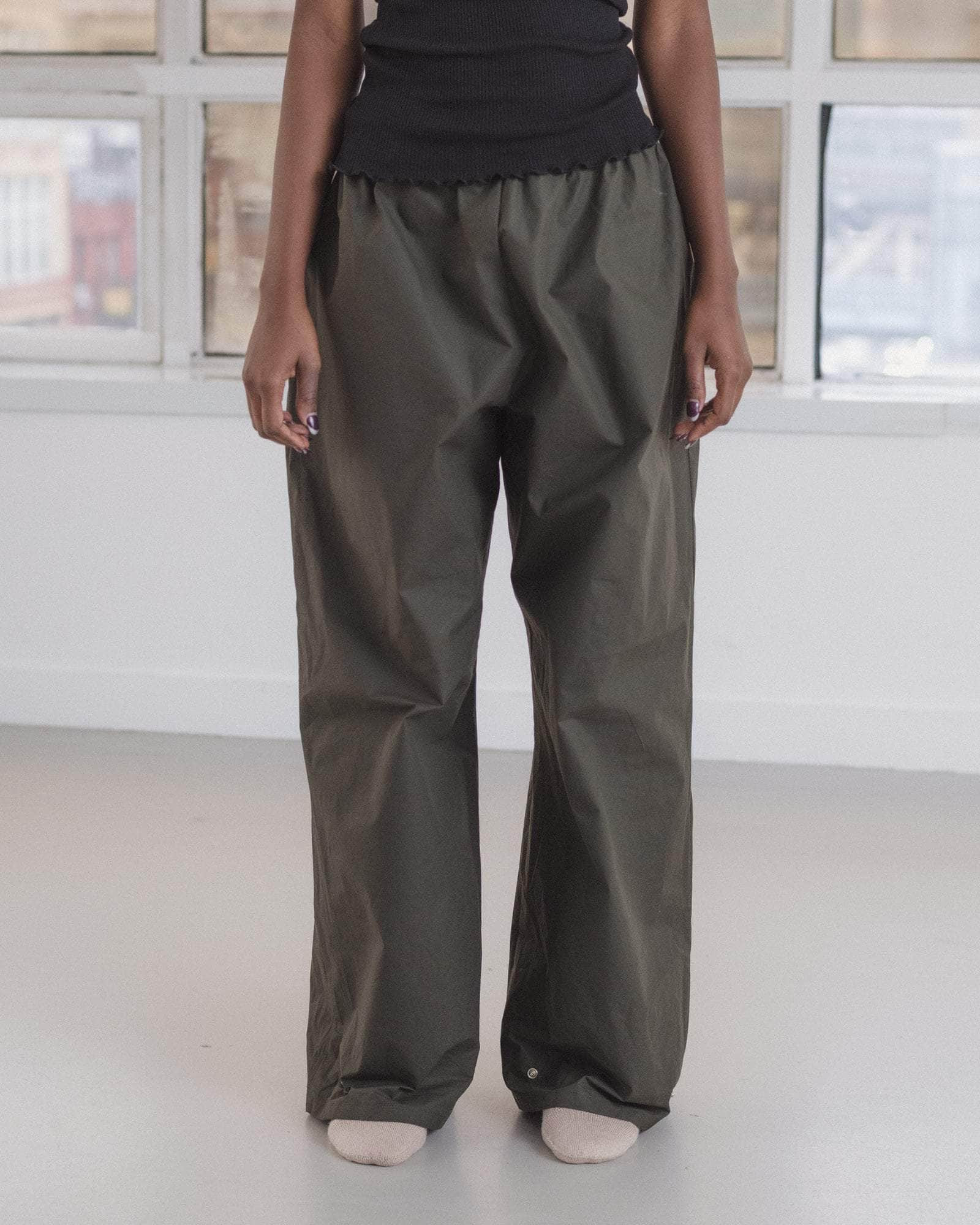 Product Details Waxed cotton pants Windproof Water repellent Elastic waistband Snap buttons at cuffs Model wears a size S 100% Organic Cotton Made in Portugal Fiber origin - Turkiye Spun in Pakistan Woven in Pakistan Sewn in Portugal Material Waxed cotton Origin: Scotland Certificates: OCS, Bluesign, BCI - Waxed or oilskin cotton provides water-repellent properties without the use of synthetic material - Waxed cotton adjusts to weather conditions, becoming more windproof in cold conditions - The fabric carries marks of use and wear in its creases, showing life - Rewaxing can extend the fabric lifecycle - Cotton is a durable, breathable and absorbent fabric