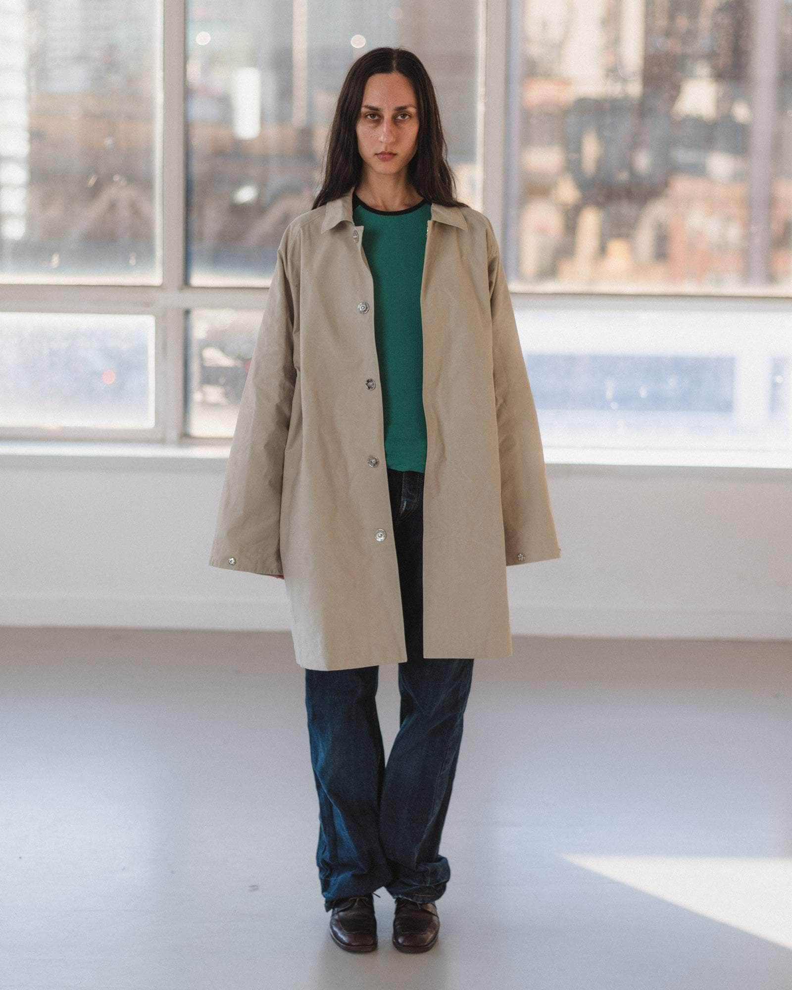 Product Details Waxed cotton coat Pockets on both sides Hidden snaps down center front Snaps at cuffs 100% Cotton Made in Portugal Model wears a size XS-S and is 172cm Material Waxed cotton Origin: Scotland Certificates: OCS, Bluesign, BCI - Waxed or oilskin cotton provides water-repellent properties without the use of synthetic material - Waxed cotton adjusts to weather conditions, becoming more windproof in cold conditions - The fabric carries marks of use and wear in its creases, showing life - Rewaxing can extend the fabric lifecycle - Cotton is a durable, breathable and absorbent fabric