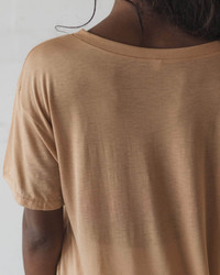 Product Details Bamboo lyocell tee Wide neck Drop sleeve Model wears size M and is 173cm 100% Bamboo Lyocell Made in Portugal Fiber origin – China Spun in Portugal Knitted in Portugal Sewn in Portugal Material Lyocell Origin: China Certificates: FSC - Lyocell is a manmade fiber made of natural regenerated cellulose. - The lyocell process eliminates toxic chemicals and reactions and reduces air and water emissions. - Lyocell is made from traceable wood pulp harvested from FSC-certified farms. The farms have been established on land unsuitable for food crops or grazing. - Lyocell is made of eucalyptus or bamboo trees that don’t require irrigation or pesticides and grow fast. - Lyocell fiber production itself is more environmentally friendly than cotton due to its closed-loop process. This means that up to 99% of the water and solvents used are reused. - Manufacturing lyocell does not require bleach. - Lyocell fiber is stronger than viscose both when dry and wet. - Sea cell is a similar fiber made from seaweed and sea algae with therapeutic qualities.