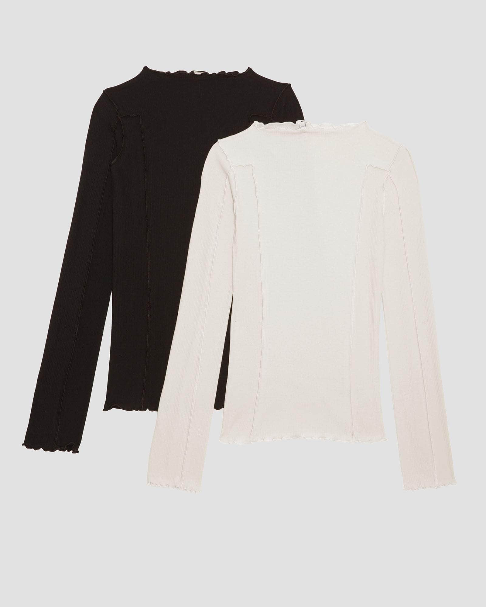 Product Details Pack of 2 organic cotton rib long sleeve tees Boatneck Exposed seams Lettuce edge at neckline and hems Runs small, consider sizing up 91% Organic Cotton 9% Elastane Made in Portugal Model wears a size S Save 15% on unit price with this pack Material Organic cotton Origin: Brazil, India, Egypt Certificates: GOTS, Oeko-Tex, OCS 100 - Cotton is a natural seed fiber. - It is durable, breathable, absorbent, and soft. Cotton is ideal for dyeing and printing. The material is also biodegradable and hypoallergenic. - Nearly all cotton is grown in rotation. Rotation crops help with pest management and soil structure. - Cotton stalks in most of the world are utilised almost entirely and seeds are essentially never wasted. - Baserange sources organic cotton, as we want to ensure that no harmful chemicals are used in the production process, water consumption is controlled, water is not contaminated and workers' rights are also preserved. - Organic agriculture uses agronomic, biological, and mechanical techniques instead of synthetic methods. - Organic cotton supports good soil health and ecosystems and is not harmful to human health or the environment. No pesticides or fertilizers are used. Most of the organic cotton we use is also rain-fed and doesn’t require much irrigation.