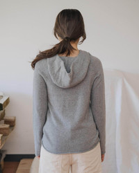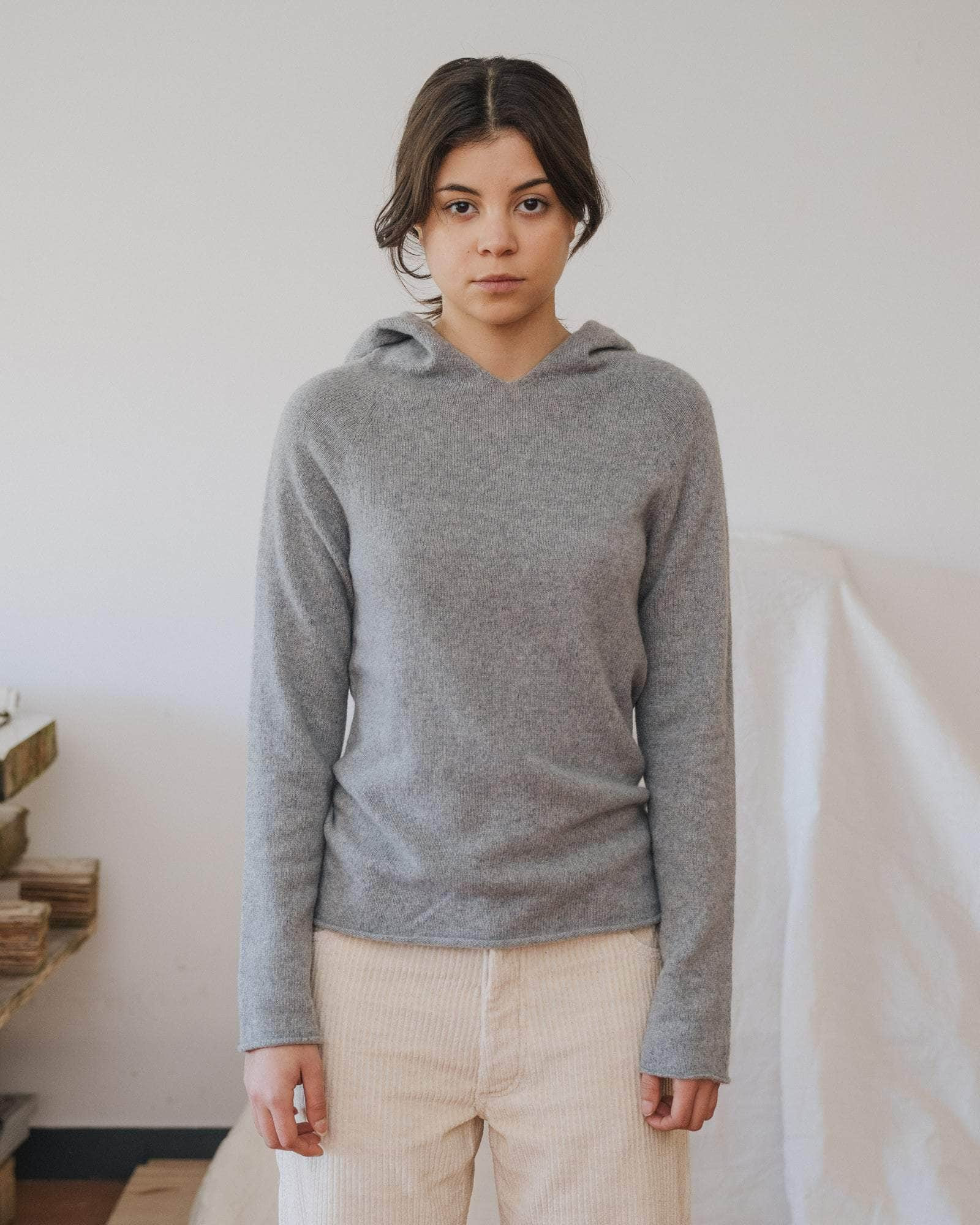 Product Details Cashmere hoodie Raglan sleeve Raw edge 95% Recycled Cashmere 5% Wool Made in France Model wears size S and is 171cm Material Recycled Cashmere Origin: Italy Certificates: GRS, Oeko-Tex - Knitted from manually selected cashmere waste, sorted by quality, colour and fibre contents. - The waste is sourced from cashmere spinners & weavers as well as collection points for worn cashmere garments. - As the fibers are already dyed, the dyeing stage does not need to be repeated. - Sorting experts combine these scraps to reach different color combinations through the mechanical spinning process. - We use recycled cashmere as it reduces methane emissions from goats, and water pollution from washing cashmere. - Recycled cashmere uses less energy, dye, and water than virgin cashmere. It also reduces the amount of fabric going into landfill and keeps materials in circulation for longer.