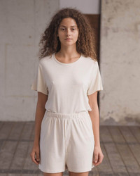 Product Details Wild silk jersey tee Crewneck Undyed True to size Model wears size S and is 172cm 100% Silk Made in Turkiye Naturally dyed Fiber origin – China Spun in China Woven in Turkiye Sewn in Turkiye Material Wild Silk Origin: China Certificates: Oeko-Tex - Wild silk is made by silkworms that live in the wild. Wild silkworms feed on and live in trees. - Wild silk is a lot more textured than regular silk. - Due to its short fiber length, wild silk is more comparable to wool. - It has the same positive attributes as silk. - The process of making wild silk is also known as non-violent, which is when the silk is processed without killing the silkworm. Once the moth leaves its cocoon, the silk is collected and processed into yarn.