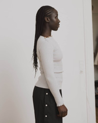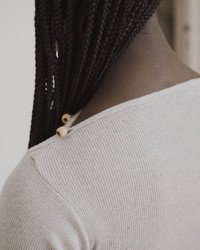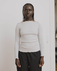 Product Details Recycled cotton rib longsleeve tee Beads at neckline 48,5% Recycled Cotton 48,5% Cotton 3% Elastane Made in Portugal Model wears a size S and is 167 cm Material Recycled Cotton Origin: Portugal, Spain, India Certifications: GRS, Oeko-tex - Recycled cotton is made from pre-consumer textiles such as cotton scraps, factory offcuts, or deadstock from virgin cotton fabric production. - Recycled cotton is often paired with virgin cotton to improve the quality of the finished fabric, as recycled cotton often has lesser yarn strength. - Making recycled cotton uses less energy, dye, and water than virgin materials. - It also reduces the amount of fabric going into landfill and keeps materials in circulation for longer.