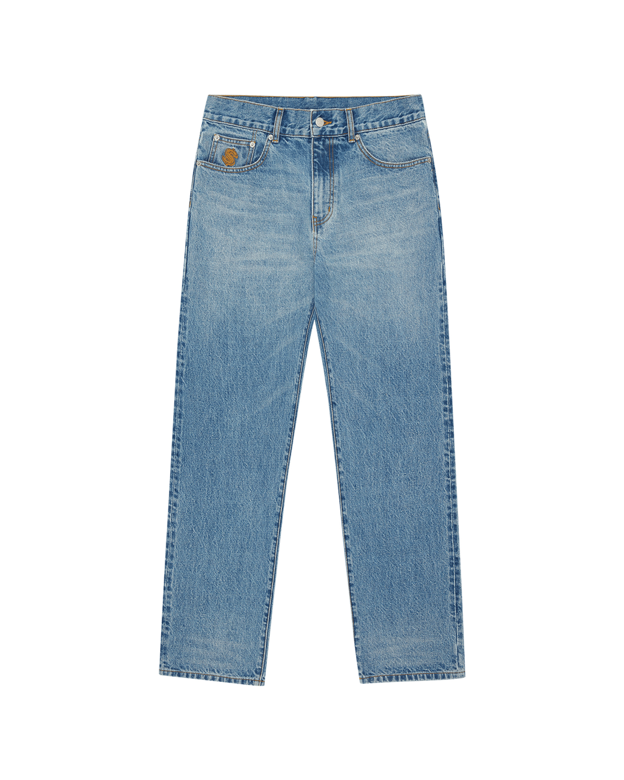 Astro Denim Pant presenting the Astro helmets embroidered at back pockets and the dollar sign at coin pocket. - Mid Wash Blue - Embroidered dollar icon at coin pocket - Embroidered Astro helmets at back pockets - Zip-fastened - 100% Cotton