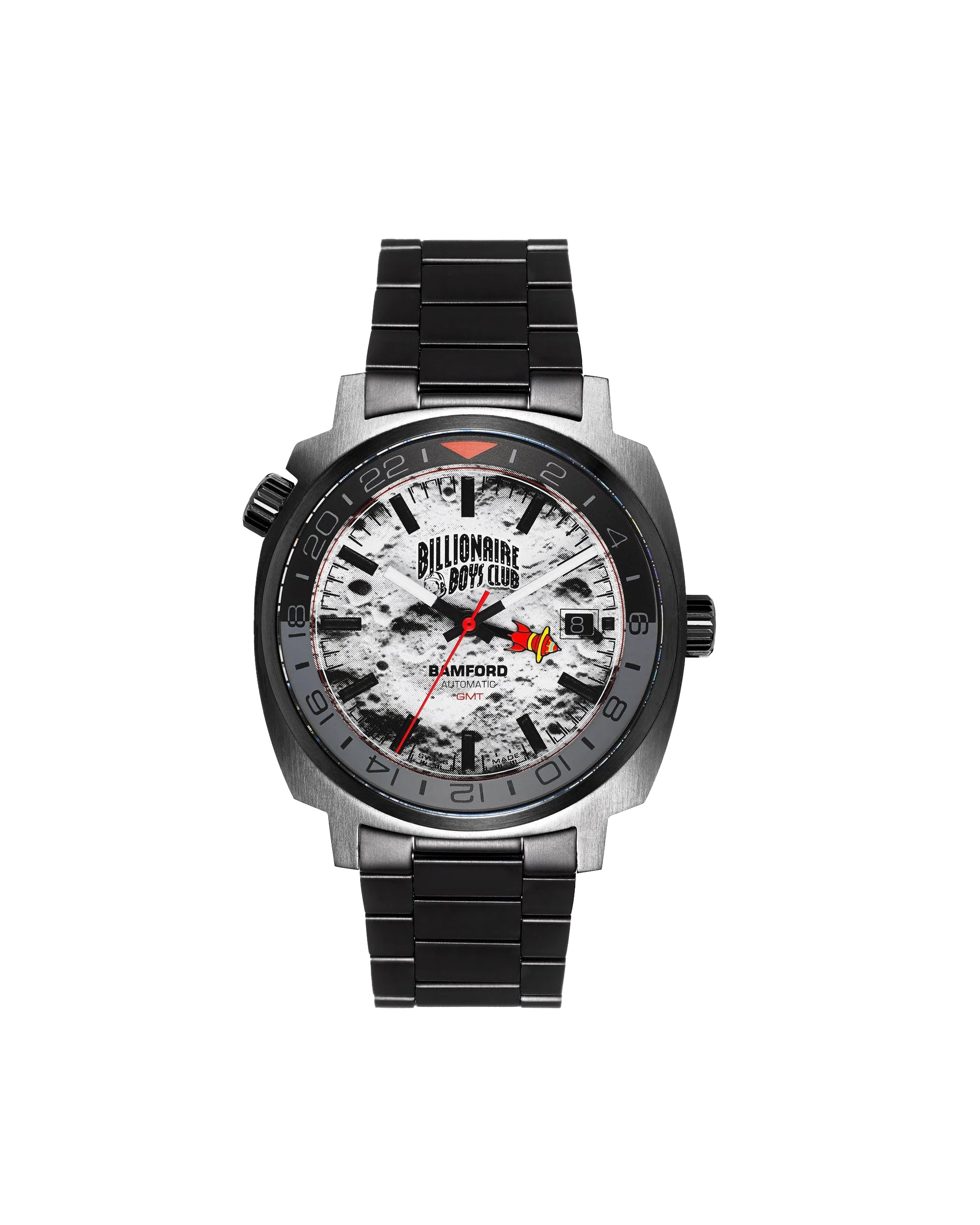 Billionaire Boys Club collaborates with Bamford London to present the 'Rocket' Automatic GMT -- a custom watch featuring BBC's iconic rocket and moon patterns. This special edition timepiece is crafted to the highest quality of Bamford London. - Automatic GMT watch with internal rotating bezel - Sellita SW330-2, 25 Jewels, 28x800 Vph, 56 hour power reserve - Self winding mechanism with ball bearing, 3 O'Clock date position with quick date setting, second time zone by central hand - Case material: 316L grade stainless steel, Sapphire Crystal glass with antiglare - Case diameter: 40mm - Case thickness: 11.7 mm - Caseback material: Stainless Steel - Water-resistance: 100m/10 ATM - Lug width: 20mm
