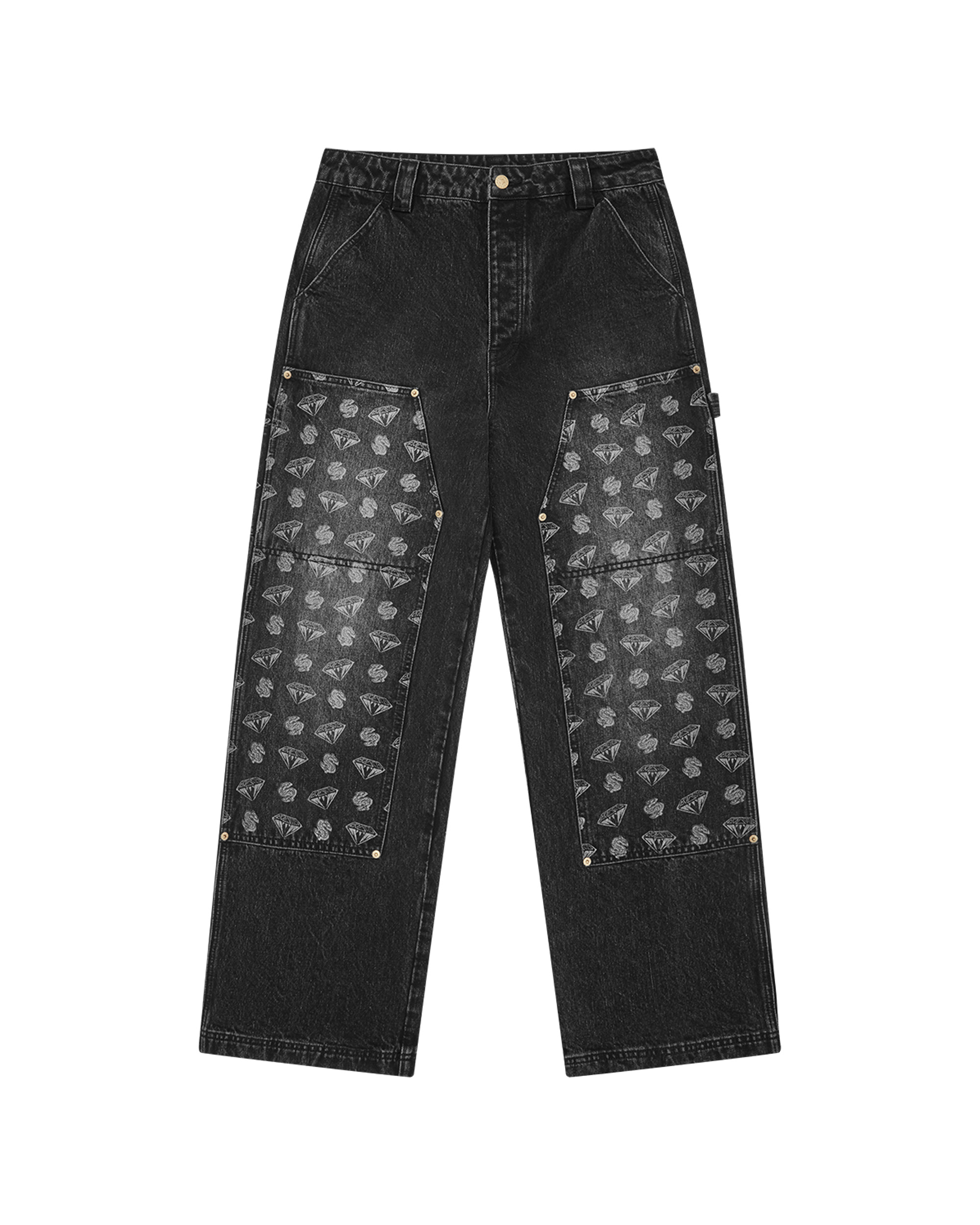 Diamonds & Dollars Denim Carpenter Pants in black wash present an all-over Diamonds & Dollar print pattern on the front leg panels and the Astro helmet on back pockets. - Black - Baggy Fit - Heavy wash on front and back thighs for a worn-effect look - All-over laser print - Diamonds & Dollar pattern on the front leg panels - Laser print Astro helmet on both the back pockets - Zip-fastened - 100% Cotton