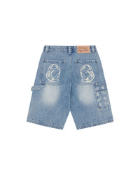 Diamonds & Dollars Denim Carpenter Shorts in light wash blue present an all-over Diamonds & Dollar print pattern on the front leg panels and the Astro helmet on back pockets. - Light Wash Blue - Baggy Fit - Heavy wash on front and back thighs for a worn-effect look - All-over laser print - Diamonds & Dollar pattern on the front leg panels - Laser print Astro helmet on both the back pockets - Zip-fastened - 100% Cotton
