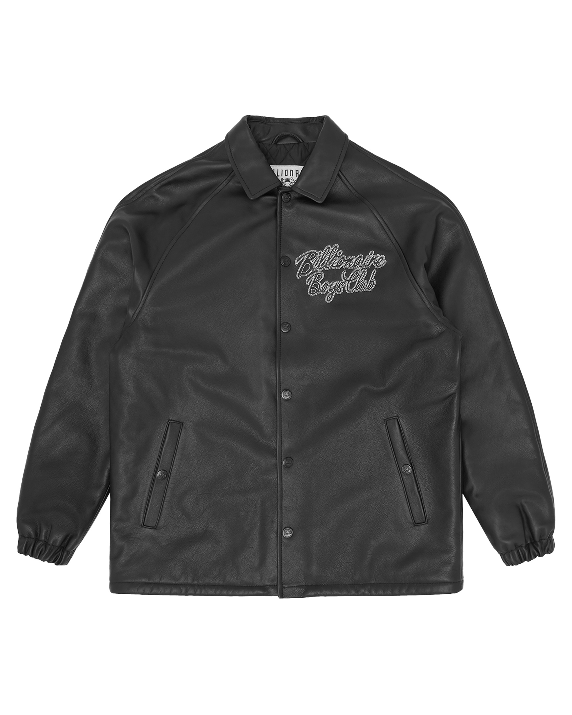 Leather Coach Jacket featuring a snap closure and a Billionaire Boys Club logo at the front left chest and back. - Black - Snap Closure - Billionaire Boys Club logo detailing on the front and back - Shell: 100% Cow Leather; Lining & Filling: 100% Polyester