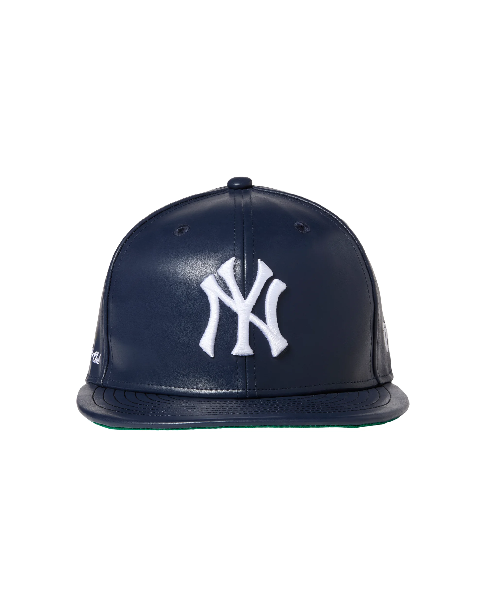 New Era NY Yankees Leather High Crown Fitted features an embroidered NYY logo on the front panel, BBC script on the right side, and "New York" on the back. - Navy - Leather high-crown fitted cap. - Embroidered BBC script on the side panel. - Embroidered New York mark at the back. - Premium material. Elevated finish. - Crown: Faux Leather - 100% Polyester