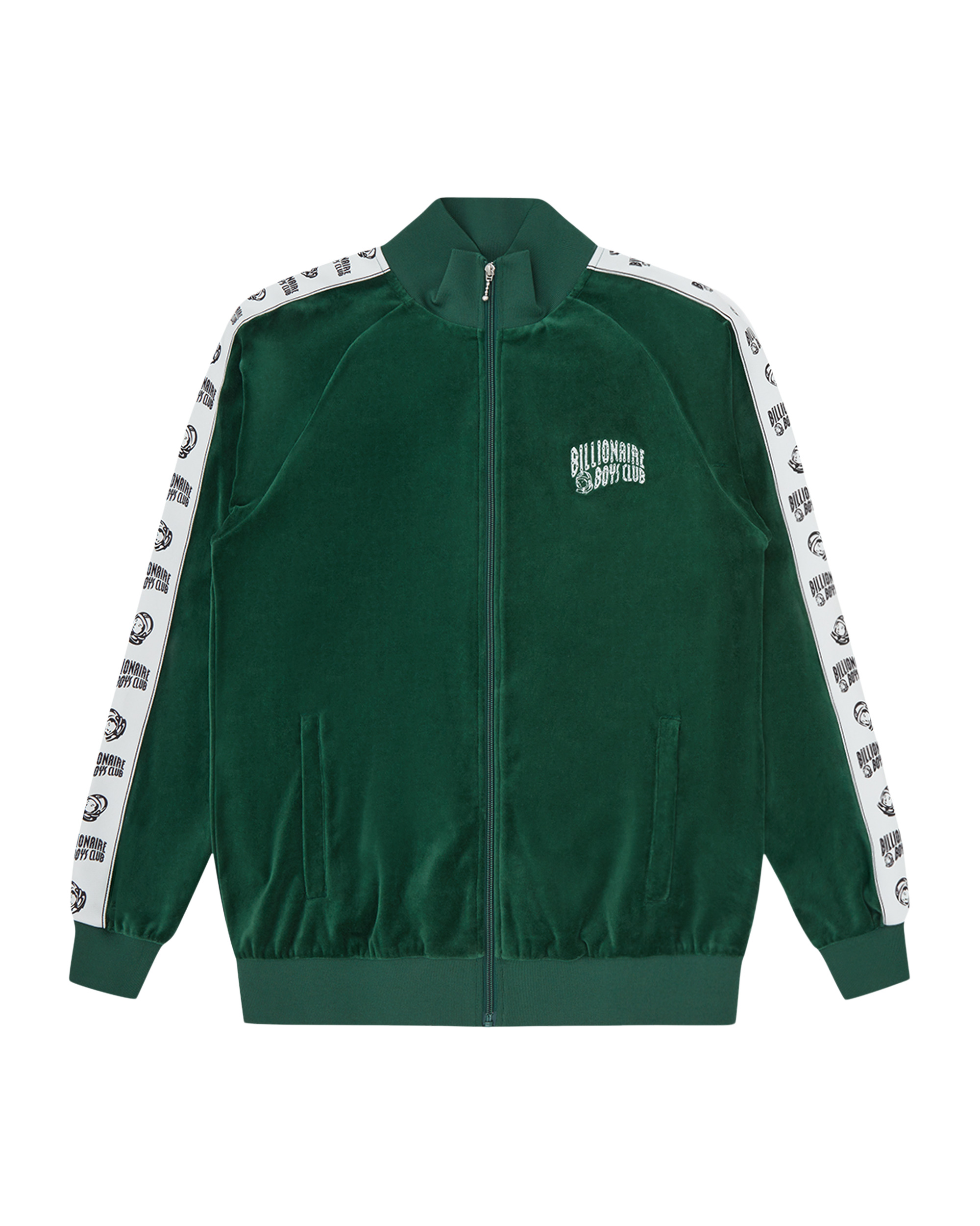 Designed to be worn alongside the Small Arch Logo Taped Velour Track Pants, this Small Arch Logo Taped Velour Track Top presents the Billionaire Boys Club Arch logo embroidered on the chest and full-length woven panelling along the sleeves. - Dark Green - Long sleeves - Branded Billionaire Boys Club side tape - Embroidered - Billionaire Boys Club Arch logo on the chest - Zip-closure - Elasticated waistband and cuffs - Two pockets with zip at front - 100% Polyester
