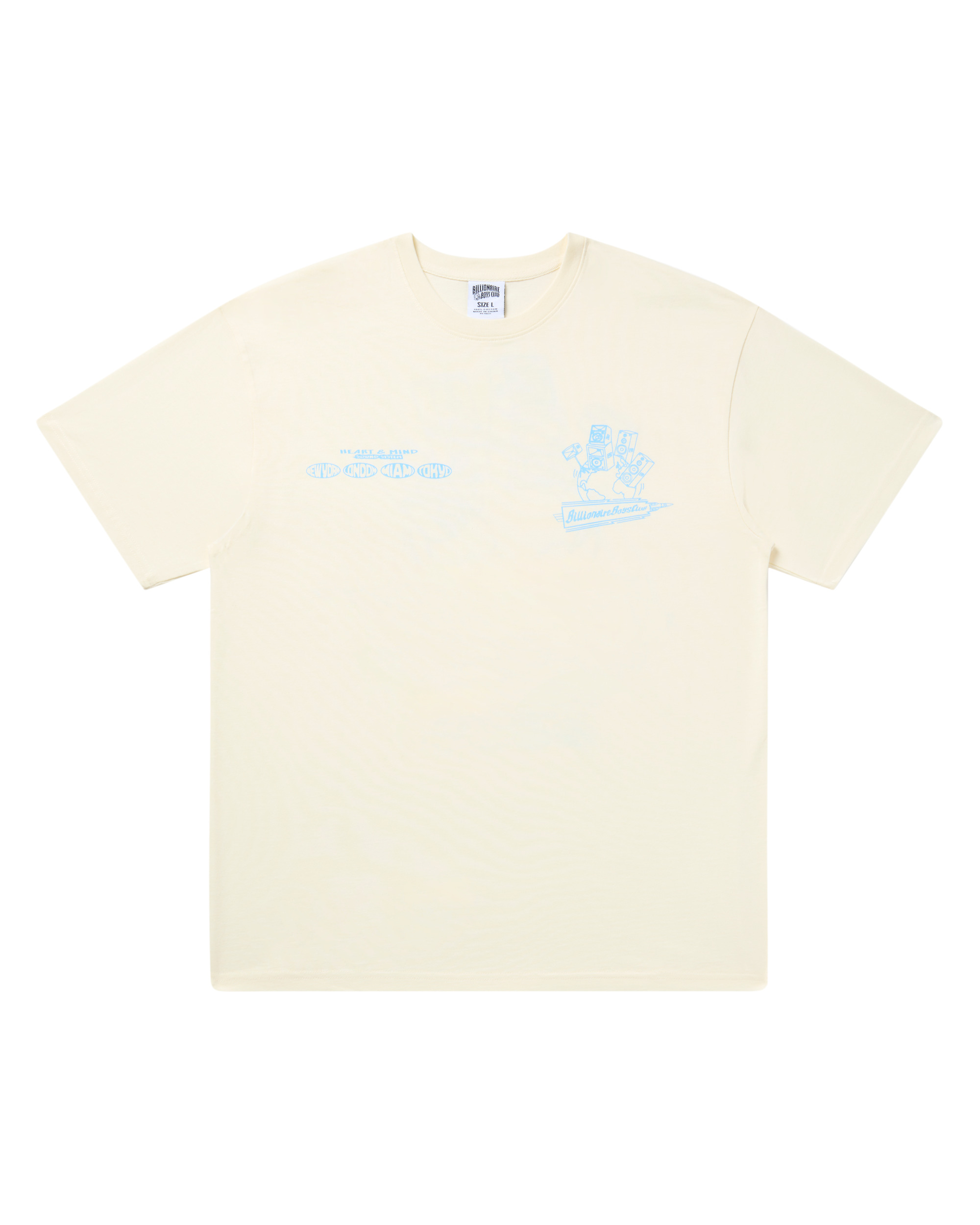 The Sound Waves Tee displays a Billionaire Boys Club graphic on the left front, city names on the right, and a globe with stereos printed on the back. - Winter White - Screen-printed graphics on the front and back - 100% Cotton