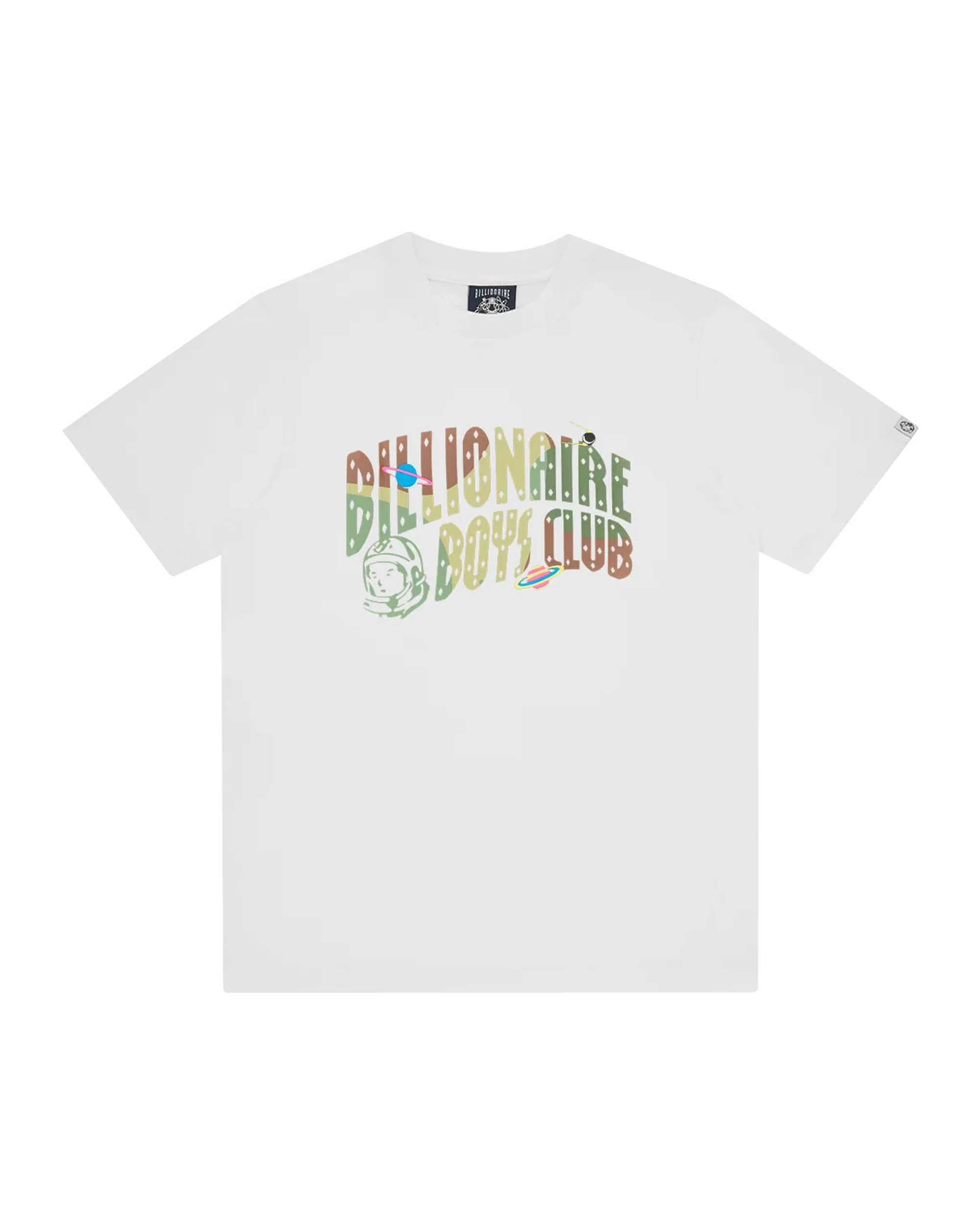 The Space Camo Arch Logo T-shirt features the Billionaire Boys Club Arch logo with a space camo filling printed at the chest and the standing astronaut at back neck. It is detailed with planet embroideries across the Arch logo on the front. - White - Regular Fit - Vintage ink screen print Billionaire Boys Club Arch Logo graphic on the chest - Embroidered planet graphics on the front - Vintage ink screen printed standing astronaut at back neck - 100% Cotton