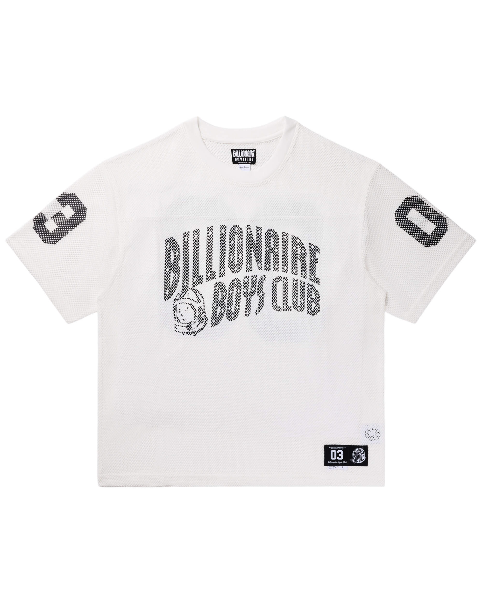 The Varsity Tee is a mesh tee that features the Curve logo on the front chest, with the number "03" printed on both the sleeves and back. - White - Cropped, boxy fit - Screen-printed graphics on the front, sleeves, and back. - 100% Polyester
