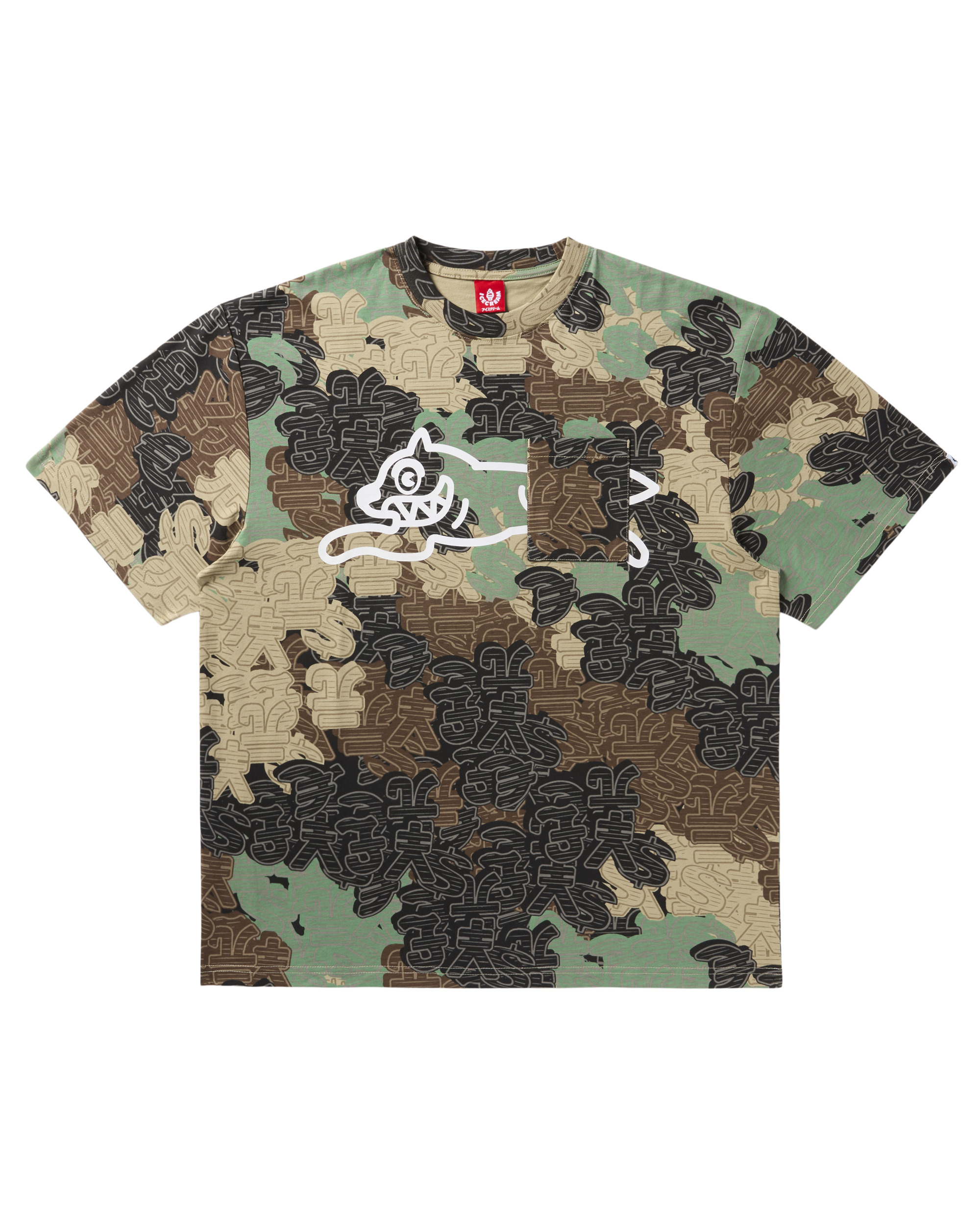 Short-sleeve tee featuring an allover camo print with tonal currency graphics and a bold Running Dog graphic across the chest. - Camo - Oversized fit - Multi-color camo with tonal currency print - Screen-printed Running Dog graphic at front - Crew neckline - Short sleeves - 100% Cotton