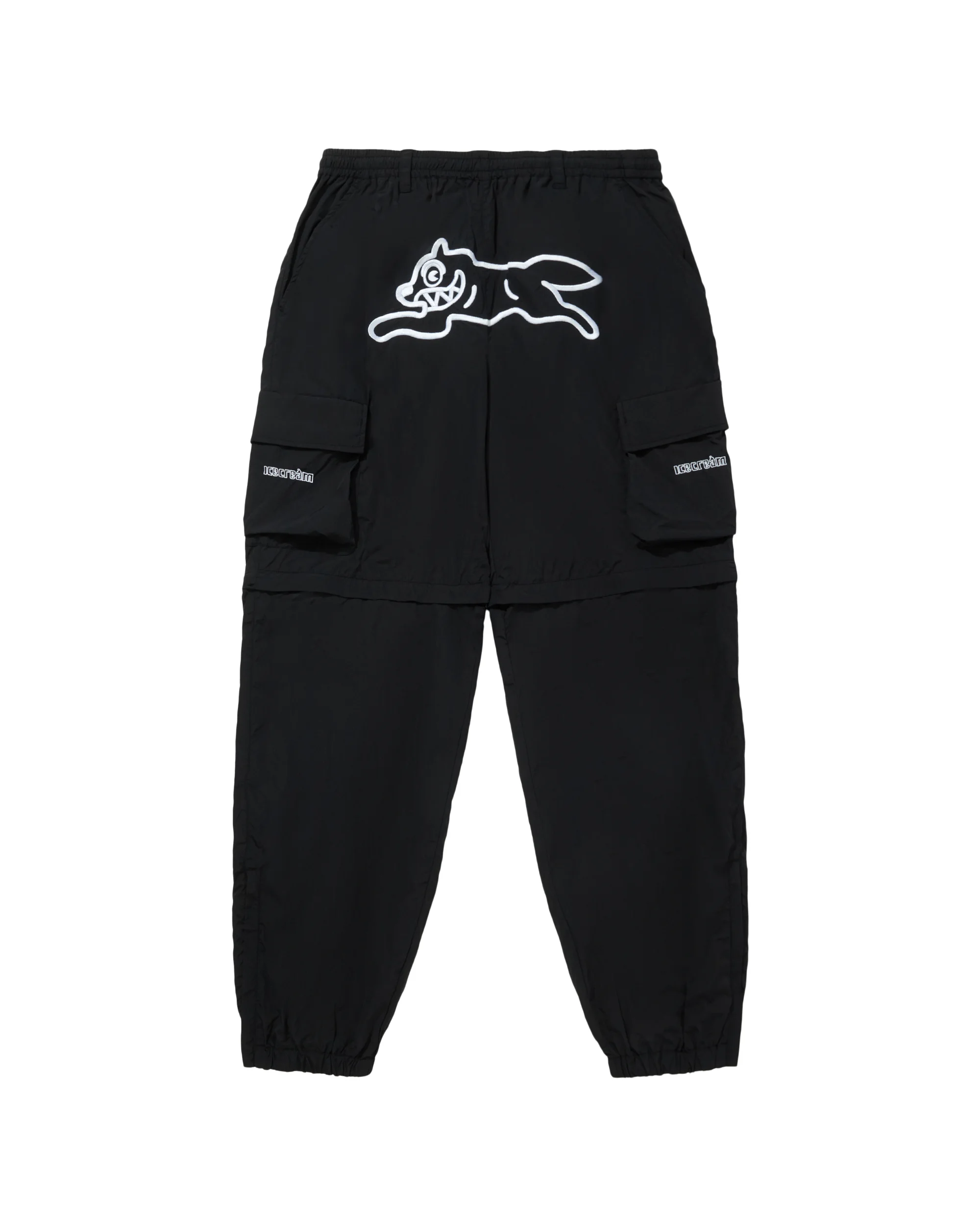 Cargo pants featuring the brand’s signature Running Dog graphic on the front. The large icon is placed on the back, and the Icecream logo is on the pockets. - Black - Running Dog graphic on the front - Icecream logo on the pockets - 100% Nylon