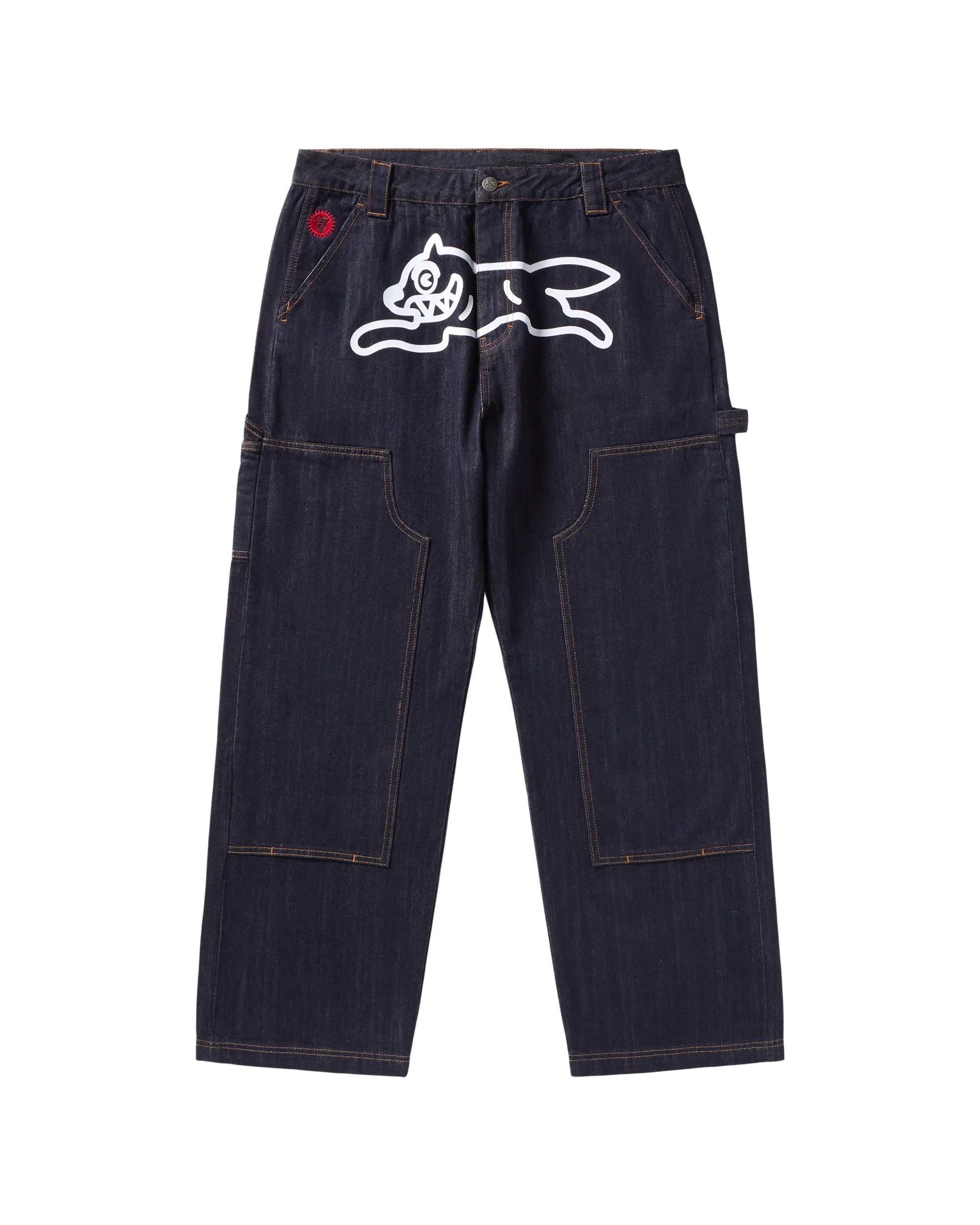 The Selvedge Running Dog Denim Carpenter Pant features the Running Dog logo on the front, IC signet embroidery at the right pocket, and Team IC logo on the back pockets. - Indigo - Running Dog printed at front - Team IC logo printed on back pockets' - IC signet embroidery - 100% Cotton