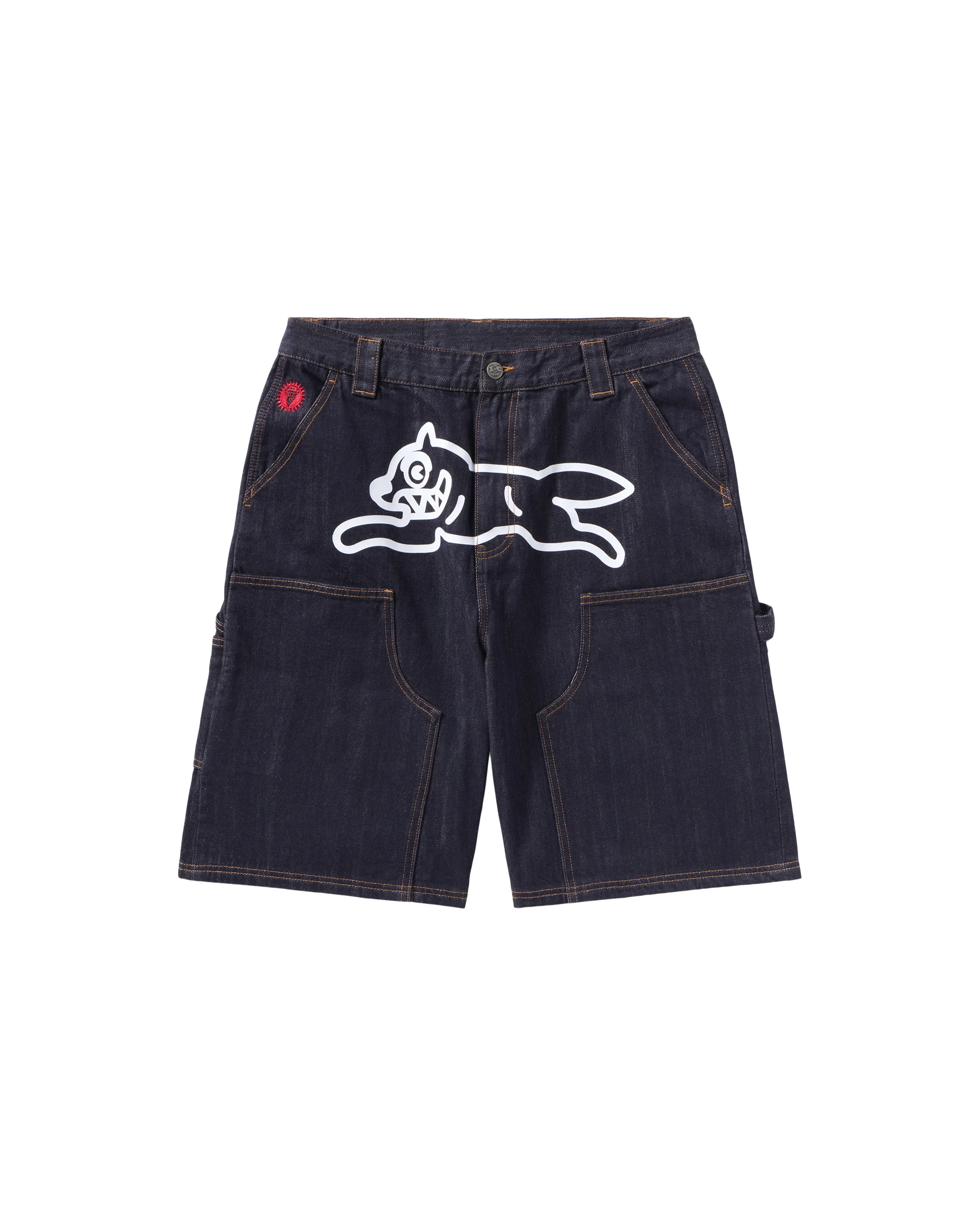 The Selvedge Running Dog Denim Carpenter Short features the Running Dog logo on the front, IC signet embroidery at the right pocket, and Team IC logo on the back pockets. - Indigo - Running Dog printed at front - Team IC logo printed on back pockets' - IC signet embroidery - 100% Cotton