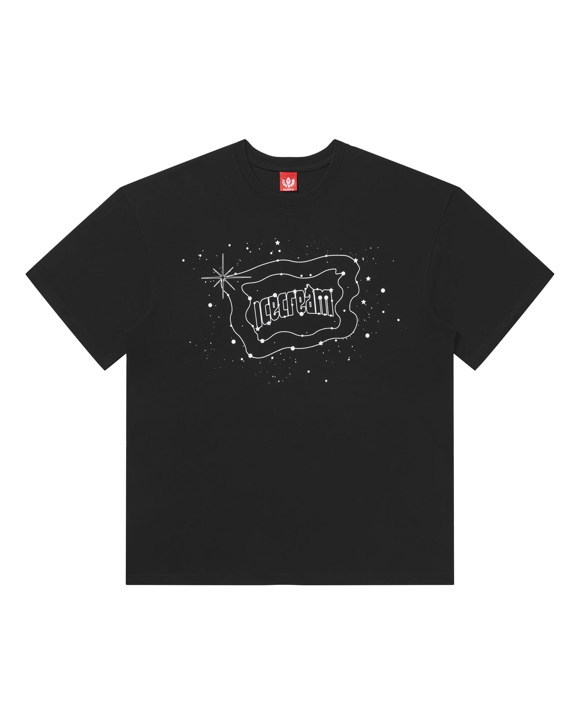 Star Gazing SS Tee features a subtle constellation-style Icecream logo with scattered stars on the front. The back displays a bold ice cream cone reimagined as a constellation with "The Flavor is Out of This World" text. - Black - Screen-printed graphics on the front and back - 100% Cotton