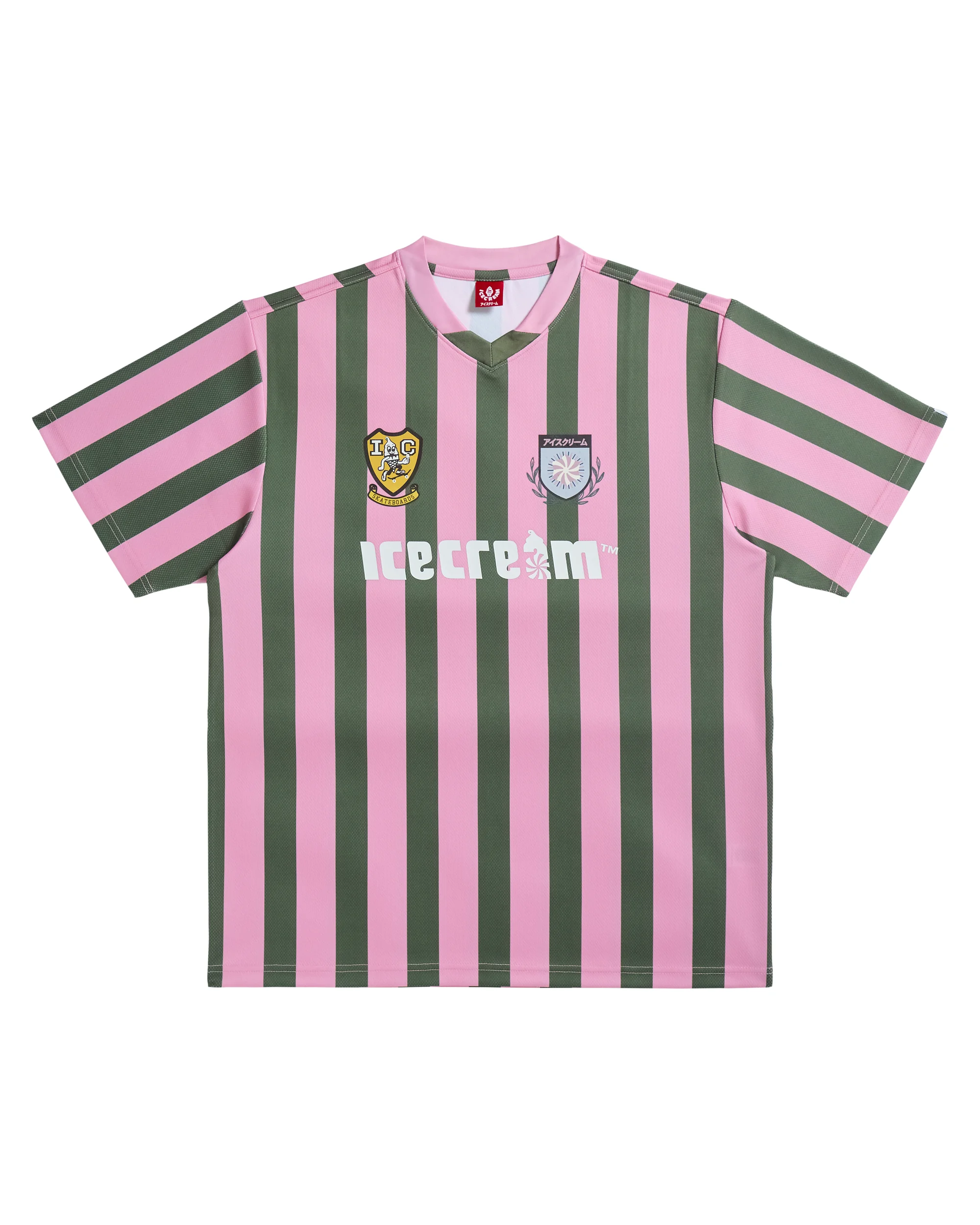 The United SS Jersey features vibrant stripes throughout and ICECREAM branding printed on the front. - Prism Pink - Vibrant stripes throughout - Screen-printed graphics at front - 100% Polyester