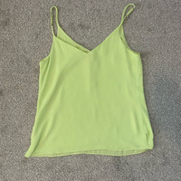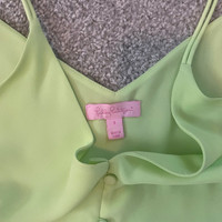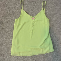 Lilly Pulitzer Lailah cami top in celery-lime green, made from 100% polyester fabric, featuring a V-neckline, button accents, and adjustable spaghetti straps