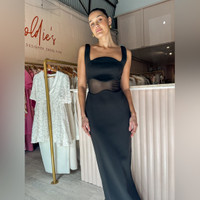 MISHA Damita Sleeveless Sheer Panel Crepe Maxi Dress The MISHA Damita Dress is a striking maxi-length gown with a curved neckline and contrasting mesh panel around the waist, offering a sleek and modern silhouette for elevated evening wear. * 95% polyester, 5% elastane * Bonded crepe fabrication * Curved neckline * Sheer mesh waist panel * Side slit * Invisible back zip * Dry clean #baddie #clean girl #old money
